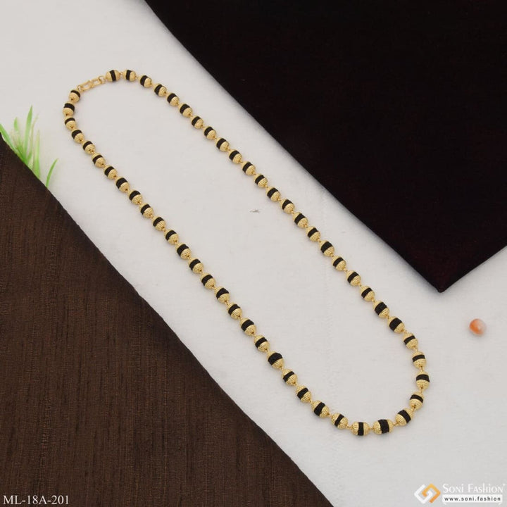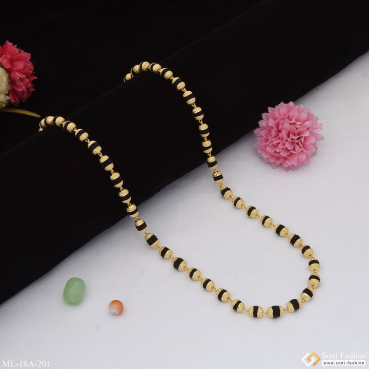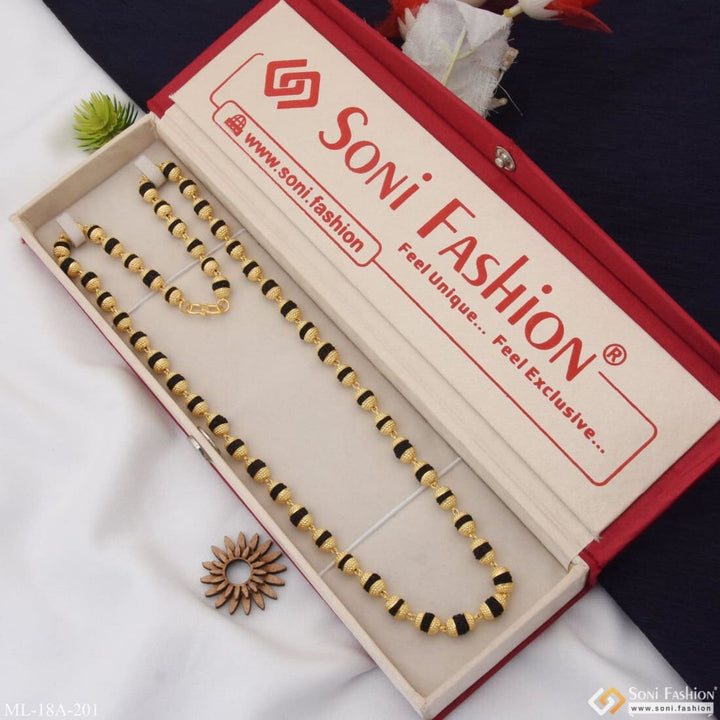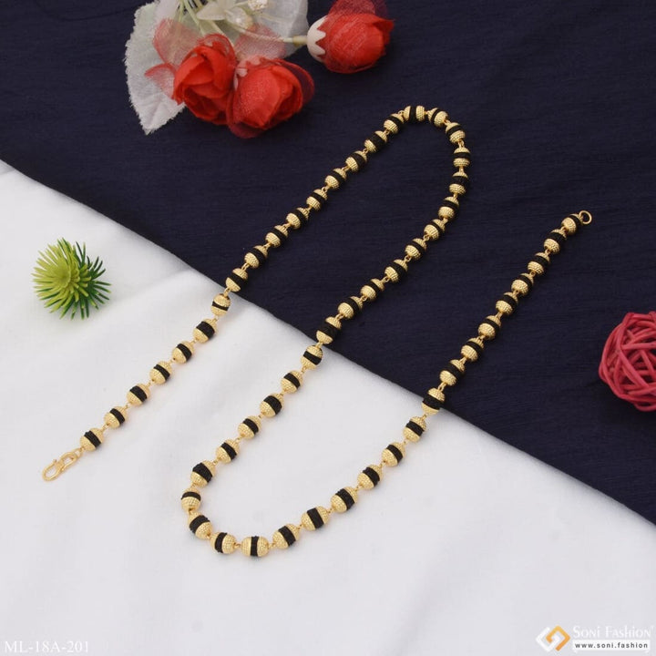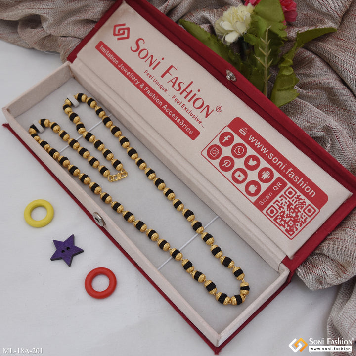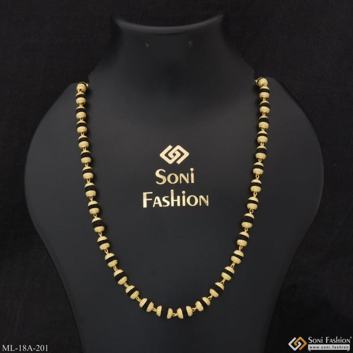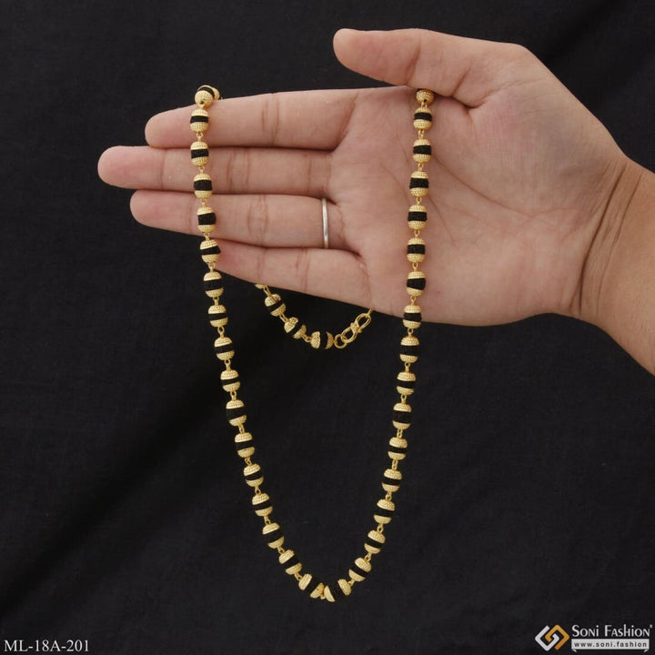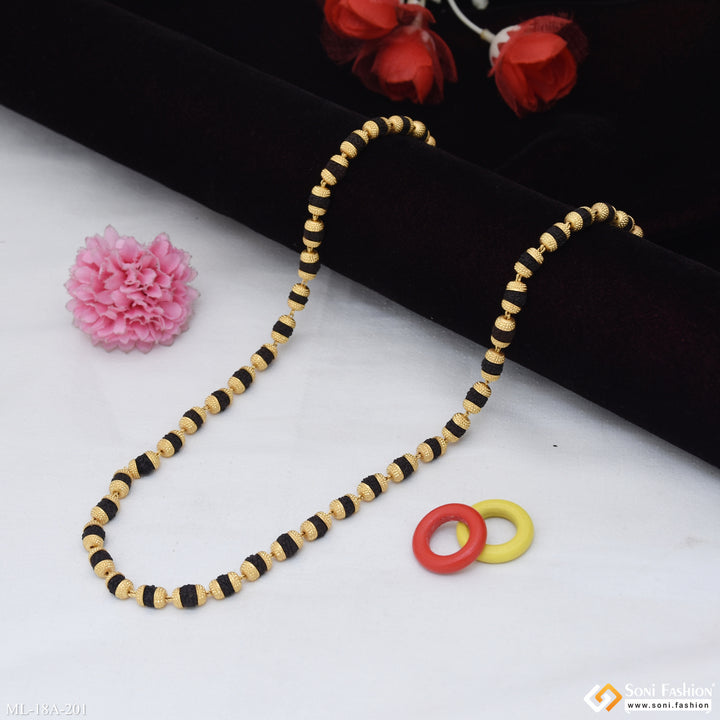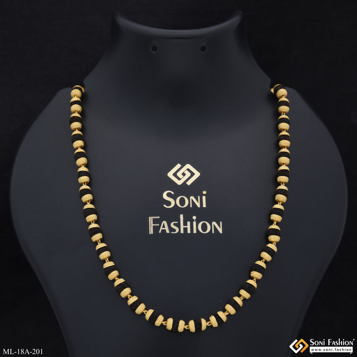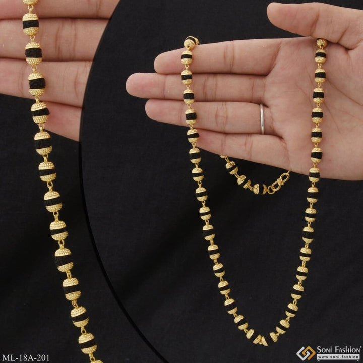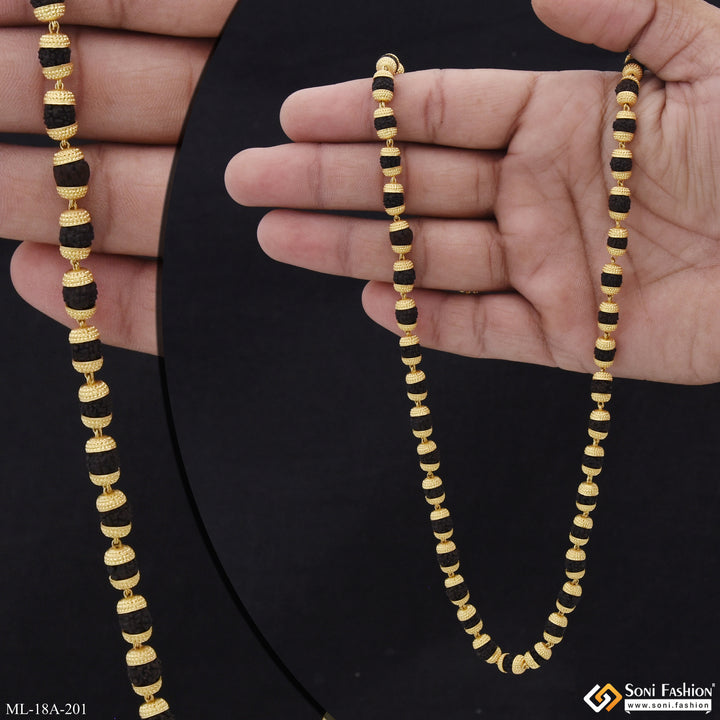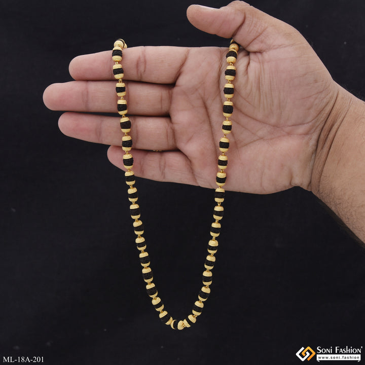 This 1 Gram Gold Formig Black Artisanal Design Rudraksha Mala for Men is a stunningly crafted piece, featuring a textured exterior, a shining finish, and authentic Rudraksha beads. It has a religious significance and is made of brass and golden mala. The perfect addition to your wardrobe.