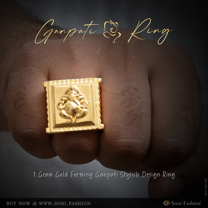 The 1 Gram Gold Forming Ganpati Stylish Design Best Quality Ring for Men is a luxurious and religious accessory that features a textured, shining and royal design. Crafted from miligram gold and brass, this golden ring has been etched with an iconic Ganpati/Ganesha figure, making it an ideal groom's accessory.