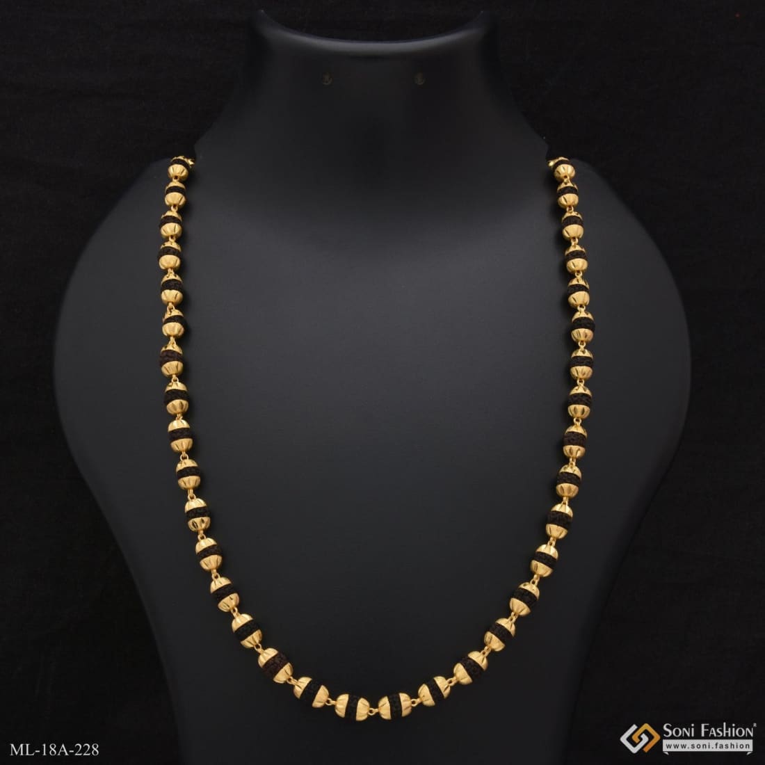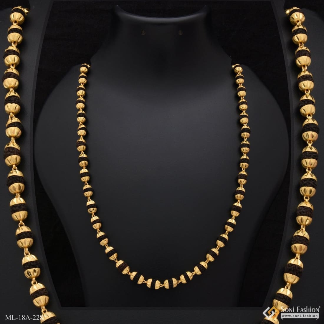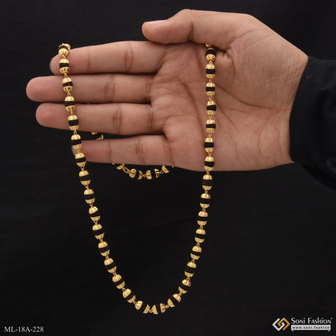 This vintage-inspired Rudraksha mala combines textured black beads with a glamorous V-cut design in miligram gold, offering a distinctive religious accessory for men. Handmade with brass and 1 gram of gold...