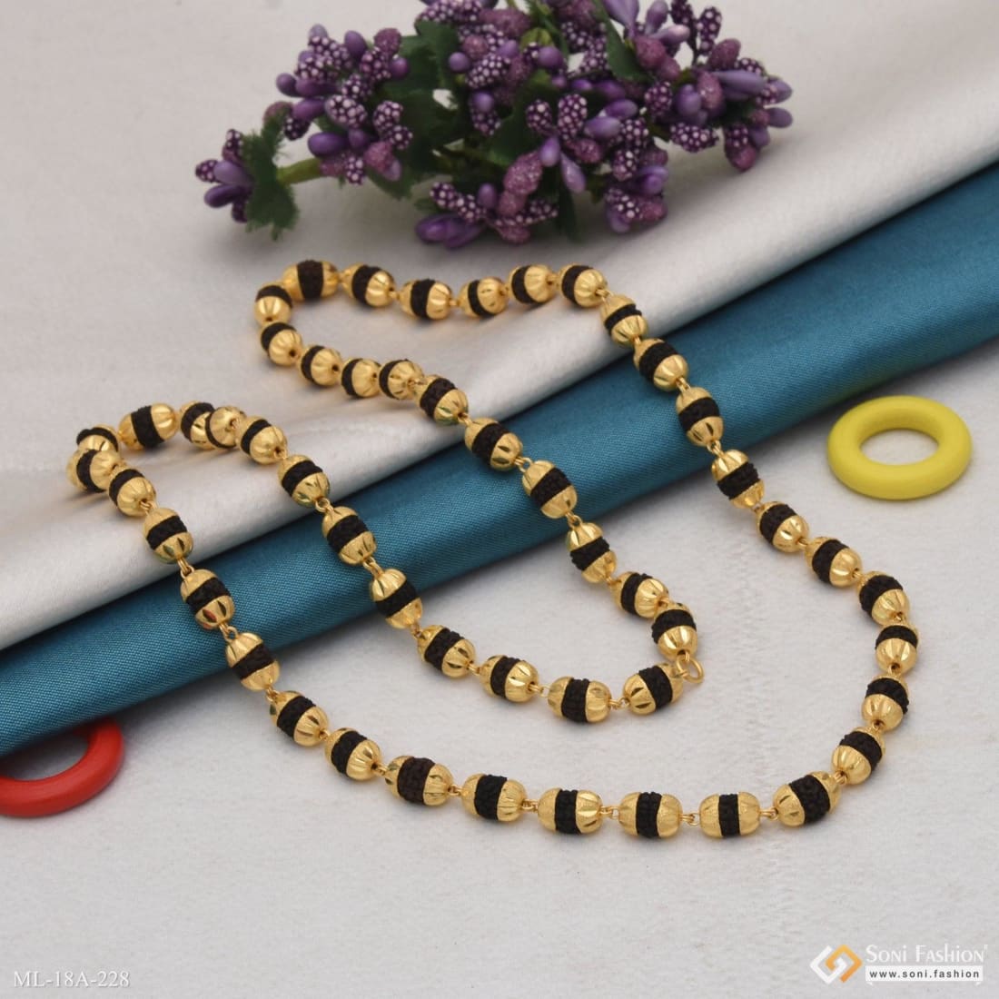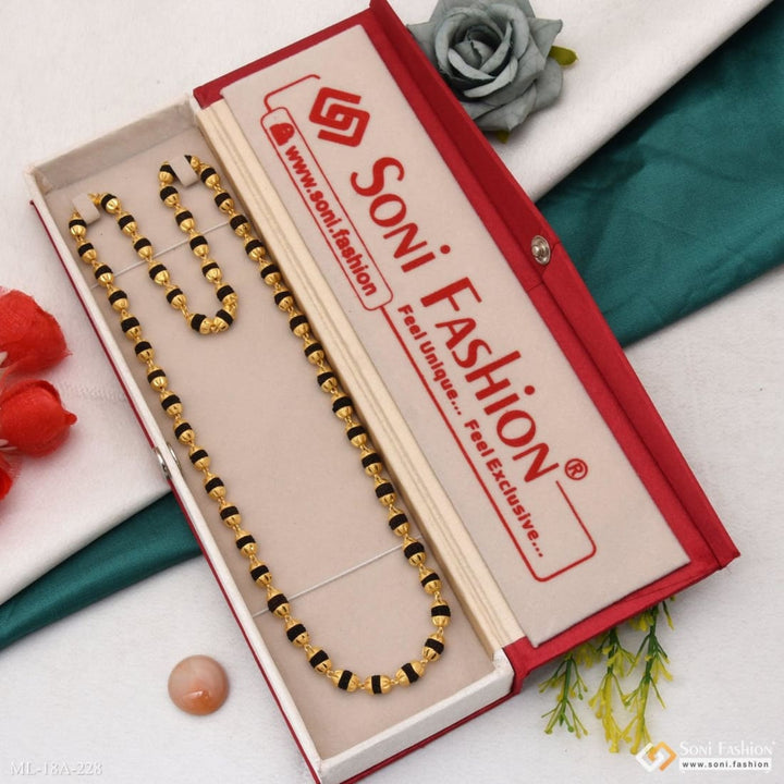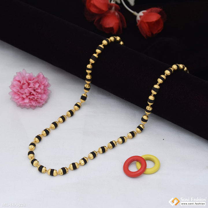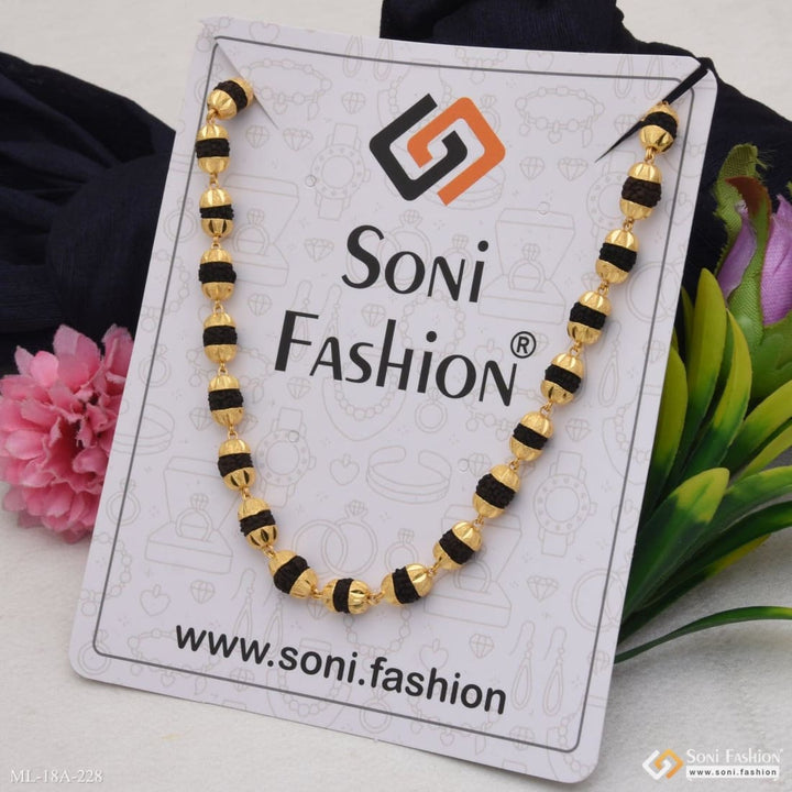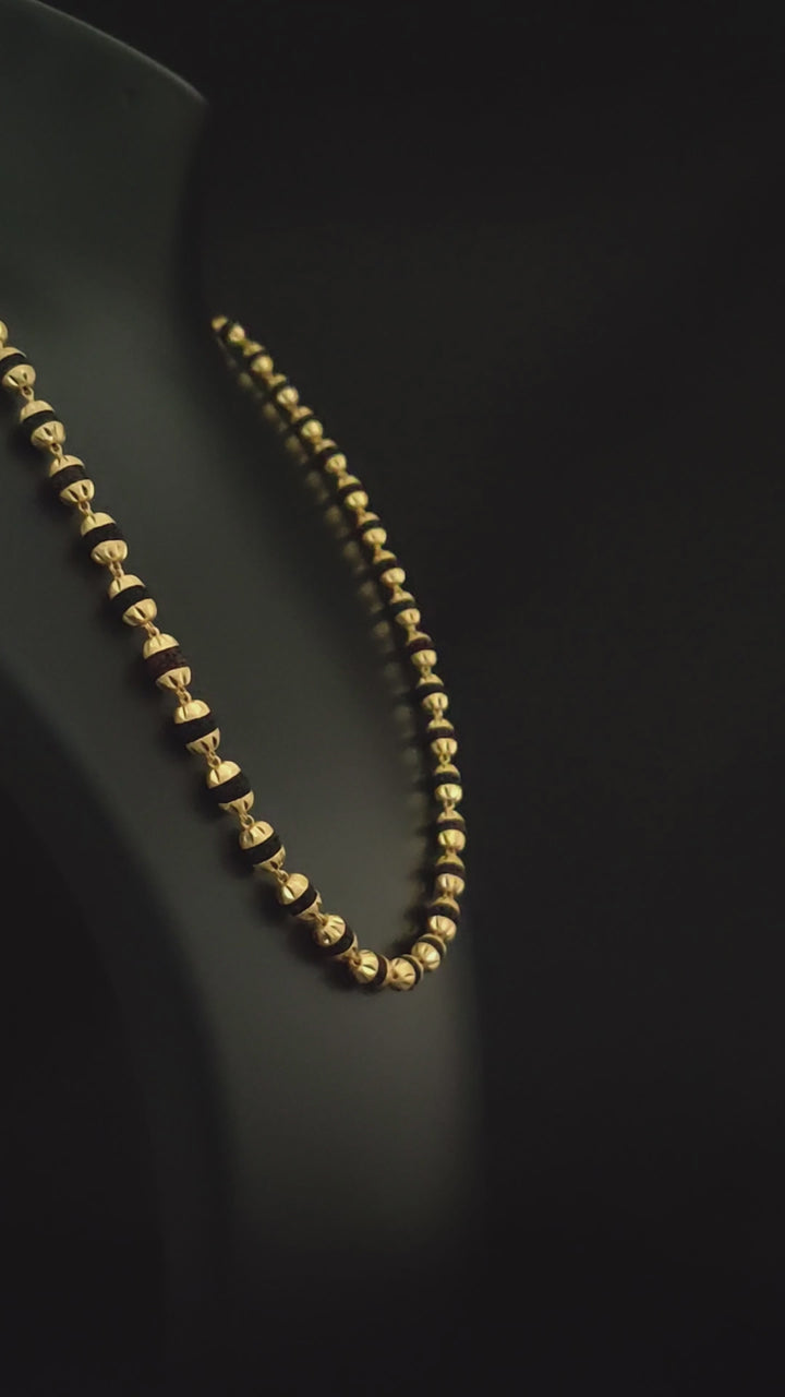 This vintage-inspired Rudraksha mala combines textured black beads with a glamorous V-cut design in miligram gold, offering a distinctive religious accessory for men. Handmade with brass and 1 gram of gold plating, this golden mala blends tradition with style, making it perfect for daily wear or spiritual occasions. The carefully crafted beads ensure durability and a comfortable fit, adding a meaningful touch to your look.