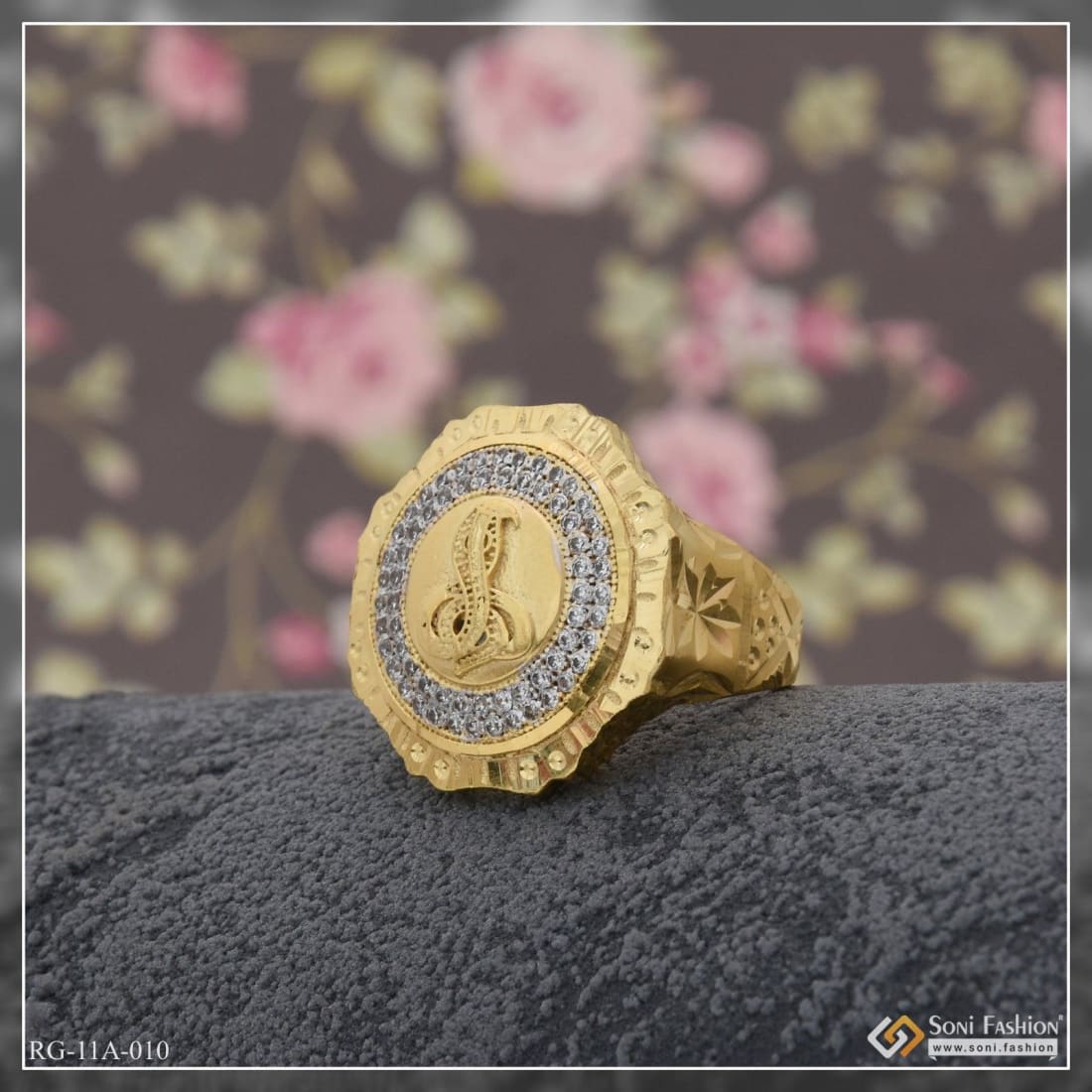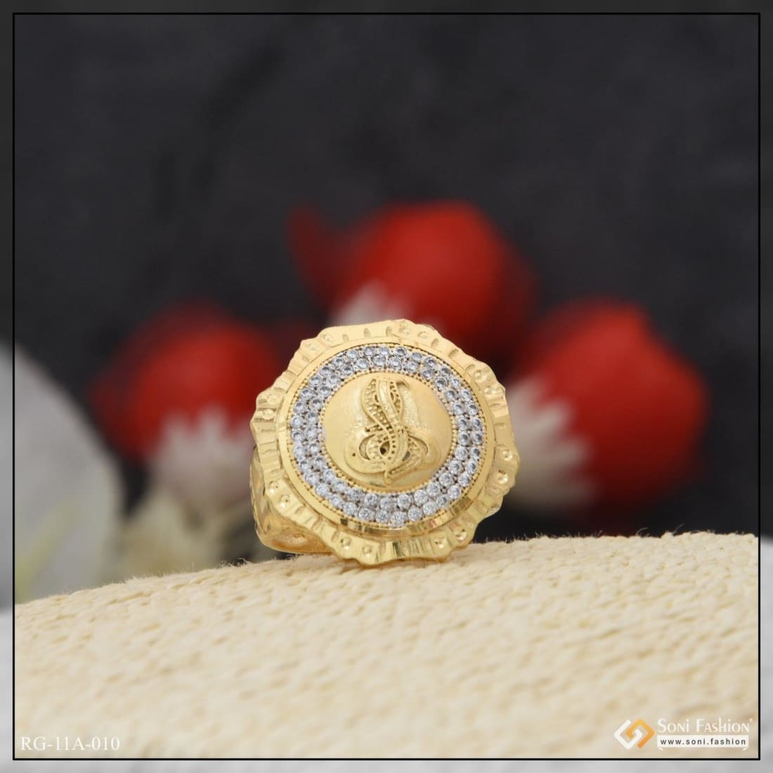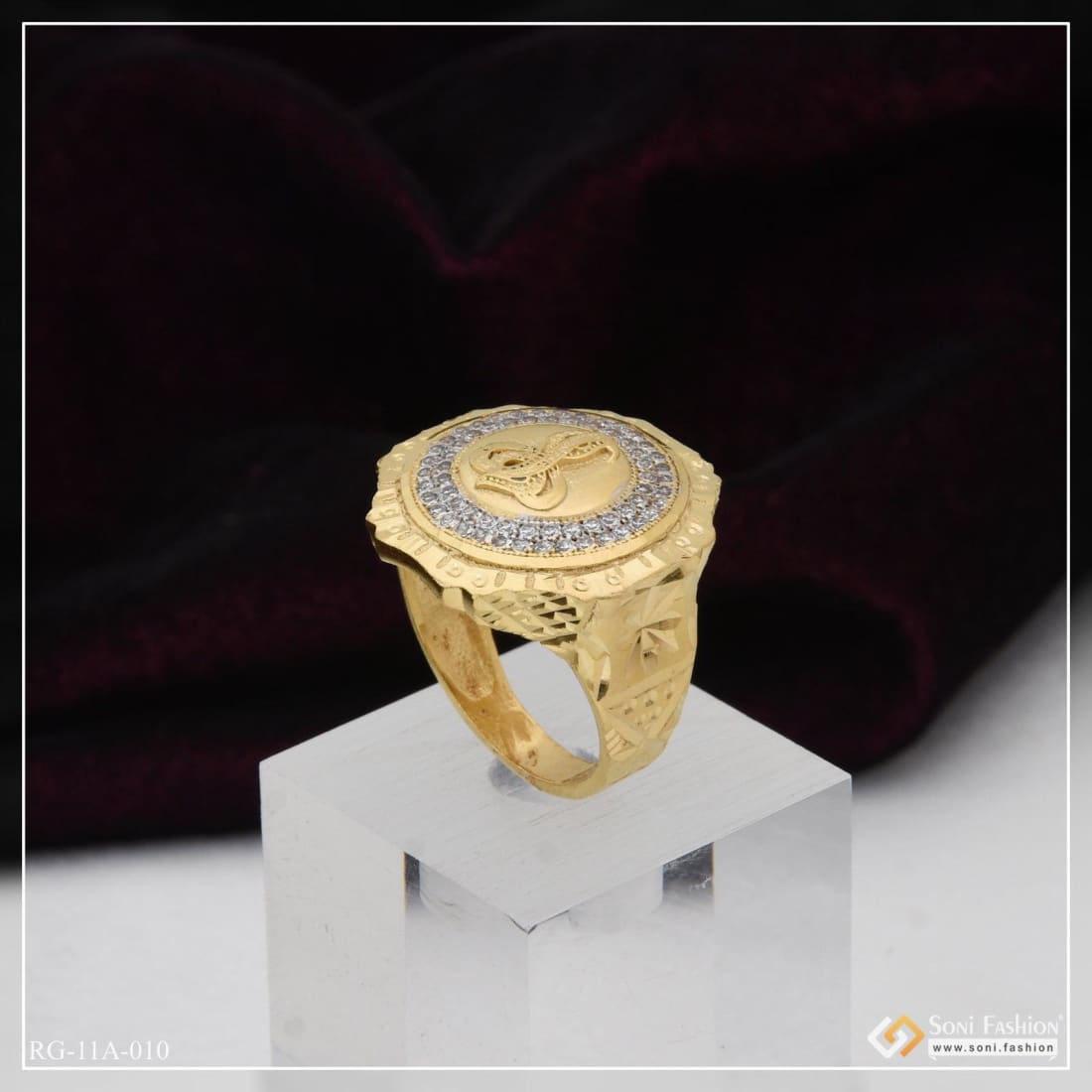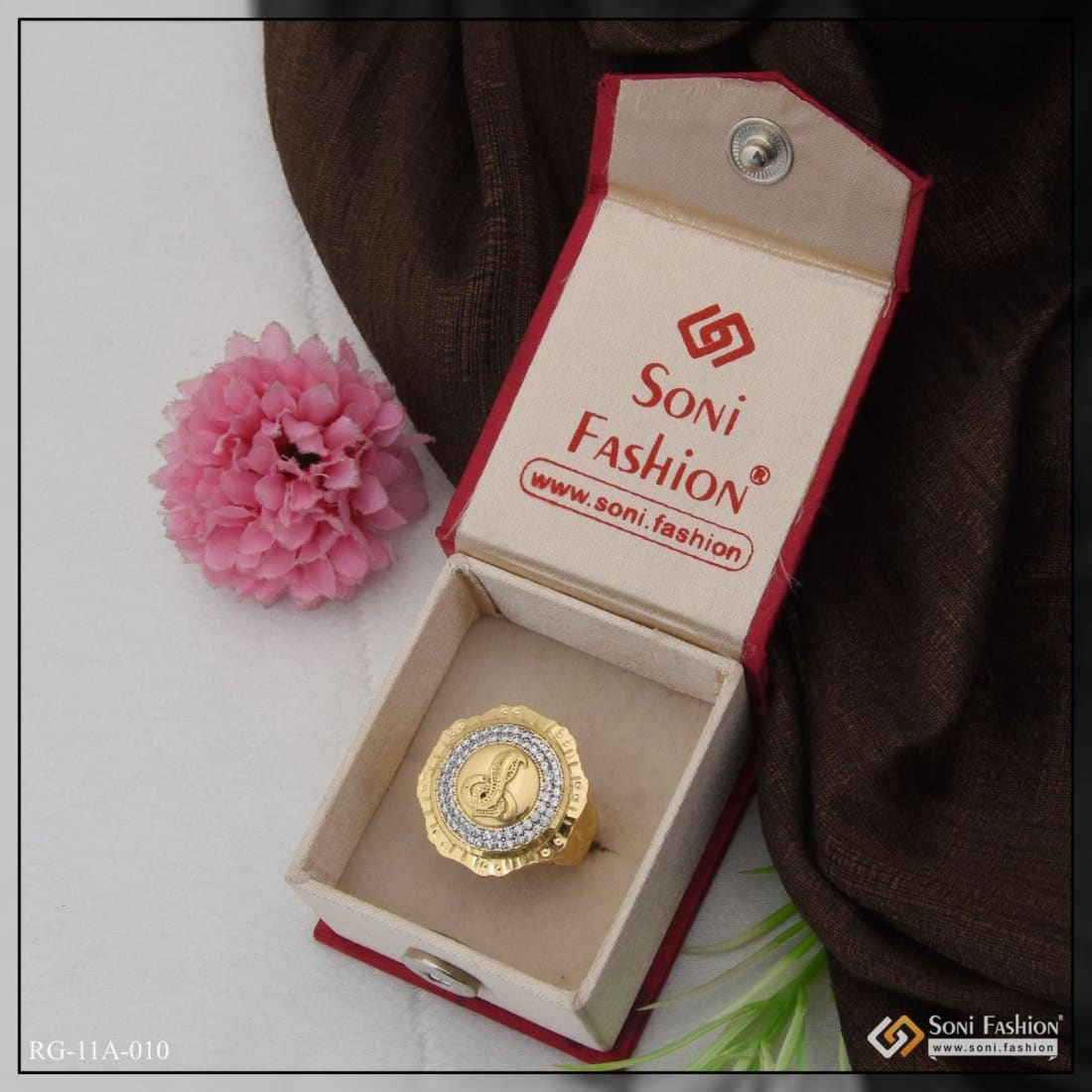 This stunning 1 Gram Gold Forming Goga with Diamond Fashionable Design Gold Plated Ring has vintage, textured, shining, round, rhodium, religious, Rajwadi, and miligram gold features. Its brass construction is beautifully...