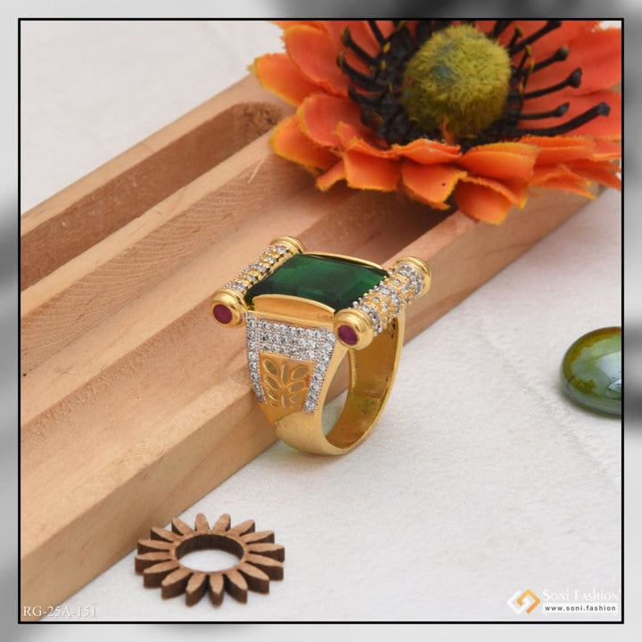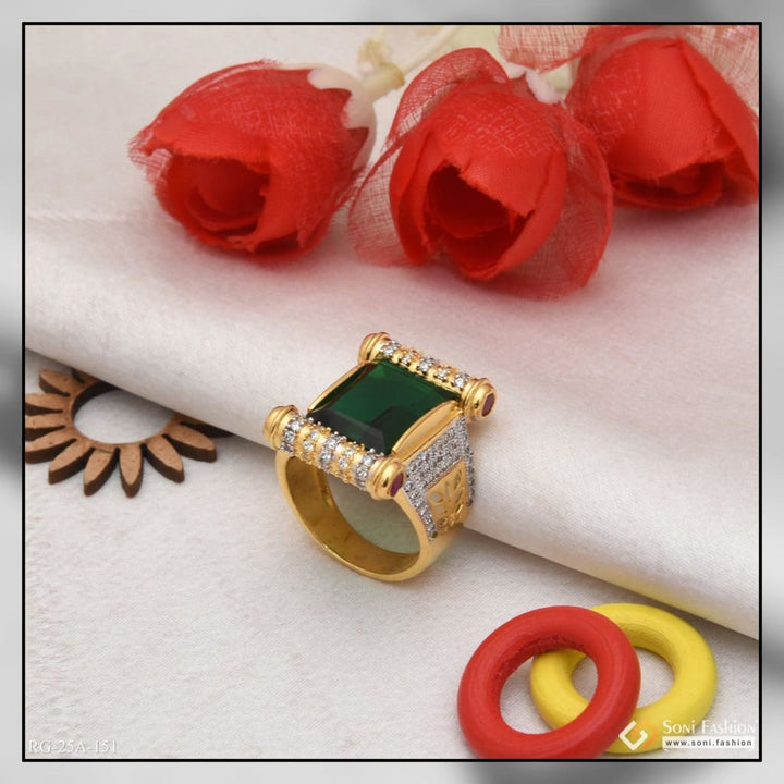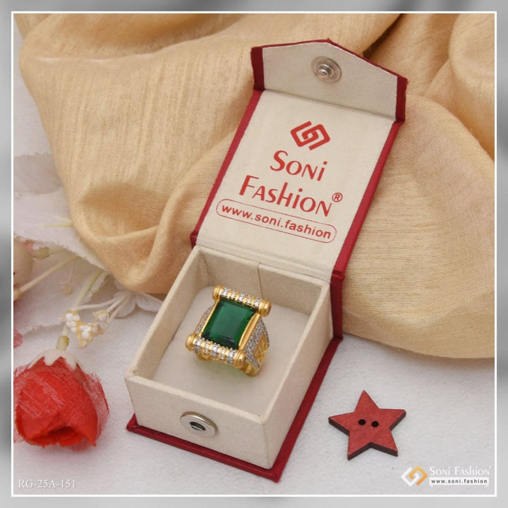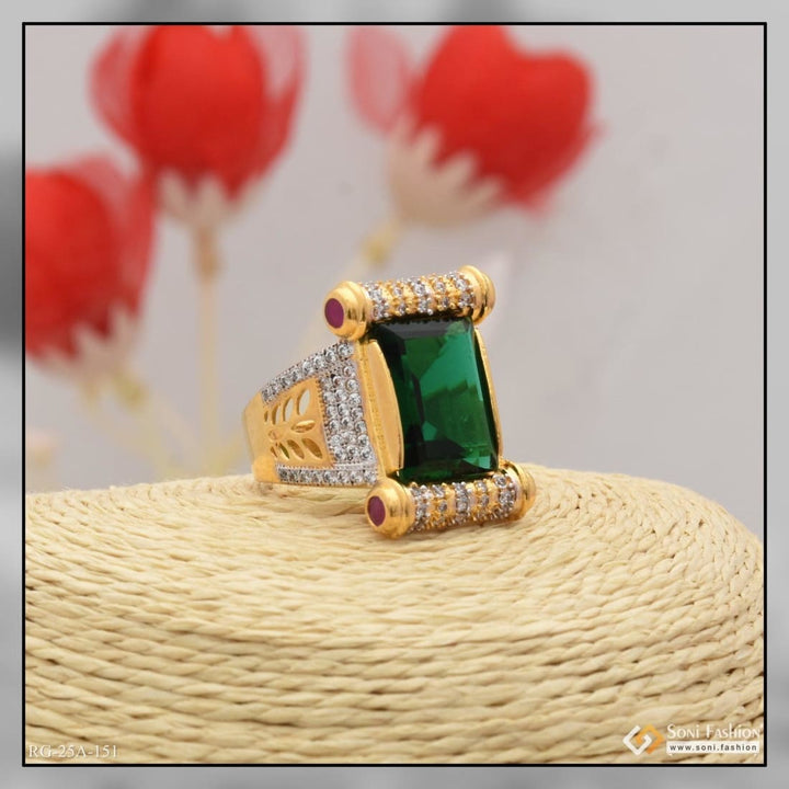 1 Gram Gold Forming Green Stone with Diamond Gold Plated Ring for Men - Style A151