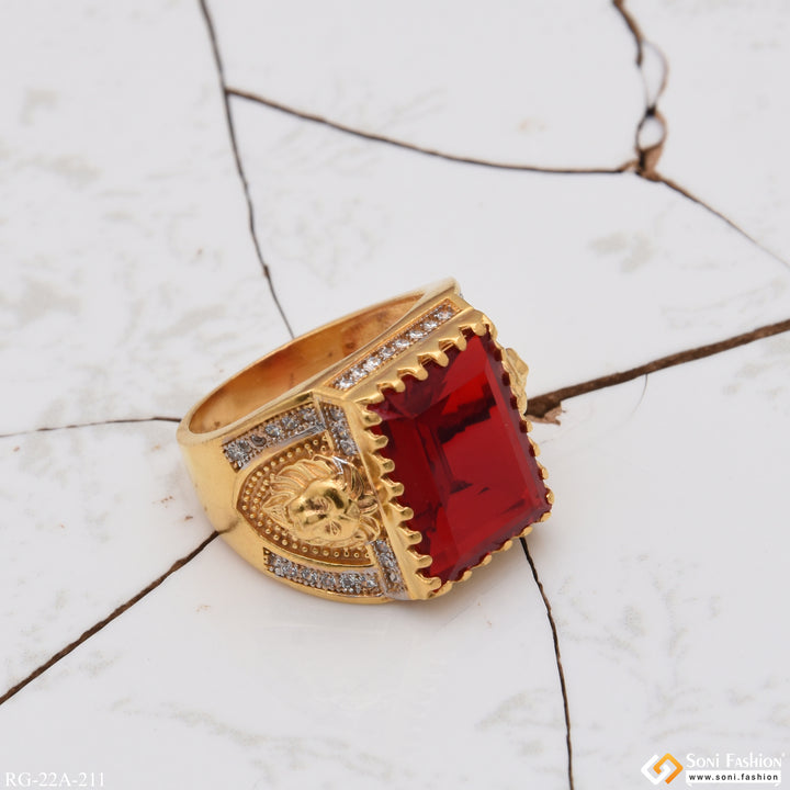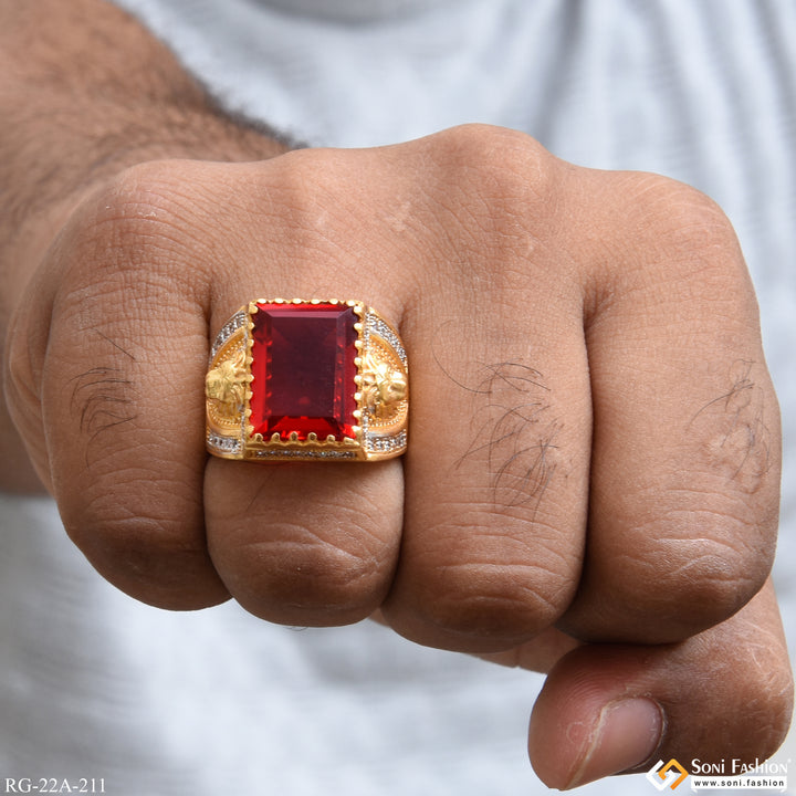 This finely detailed 1 Gram Gold Forming Red Stone with Diamond ring is crafted with textured stone and shining rhodium plated brass. The addition of royal red ring and miligram gold adds the extra charm to the groom's golden diamond ring.