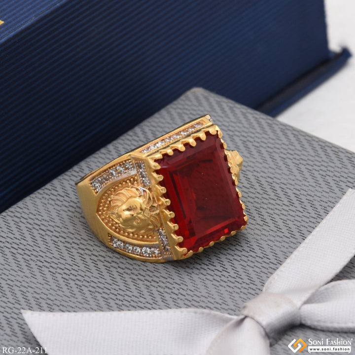 This finely detailed 1 Gram Gold Forming Red Stone with Diamond ring is crafted with textured stone and shining rhodium plated brass. The addition of royal red ring and miligram gold...
