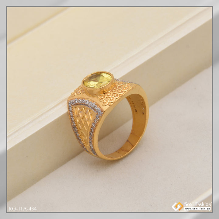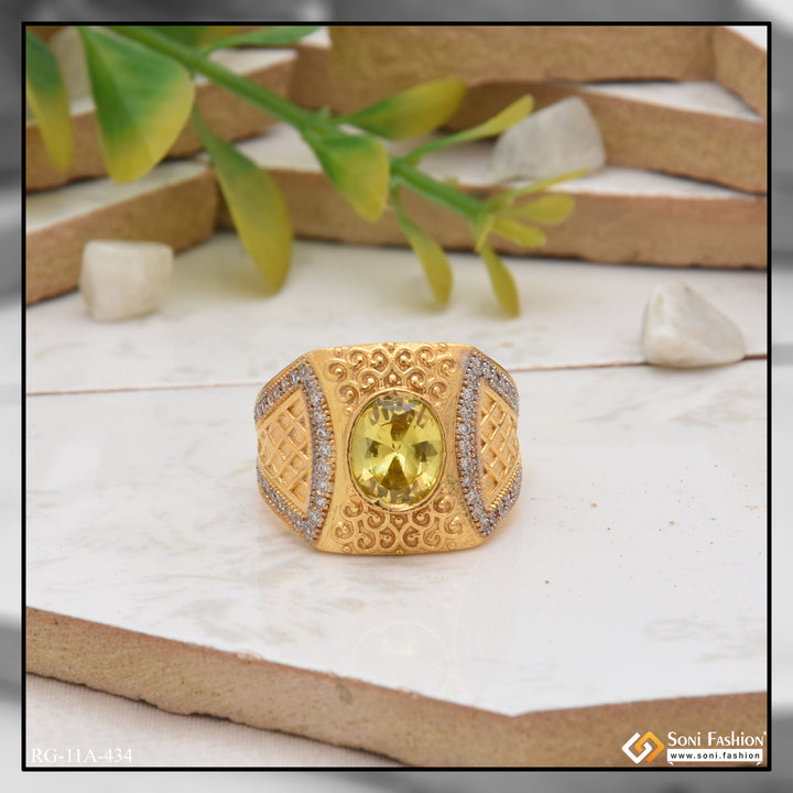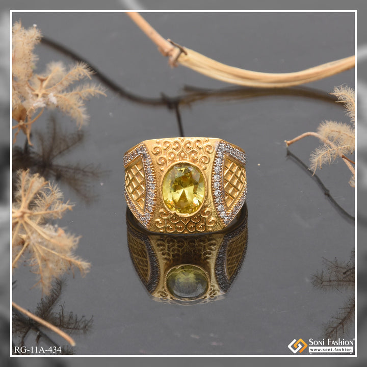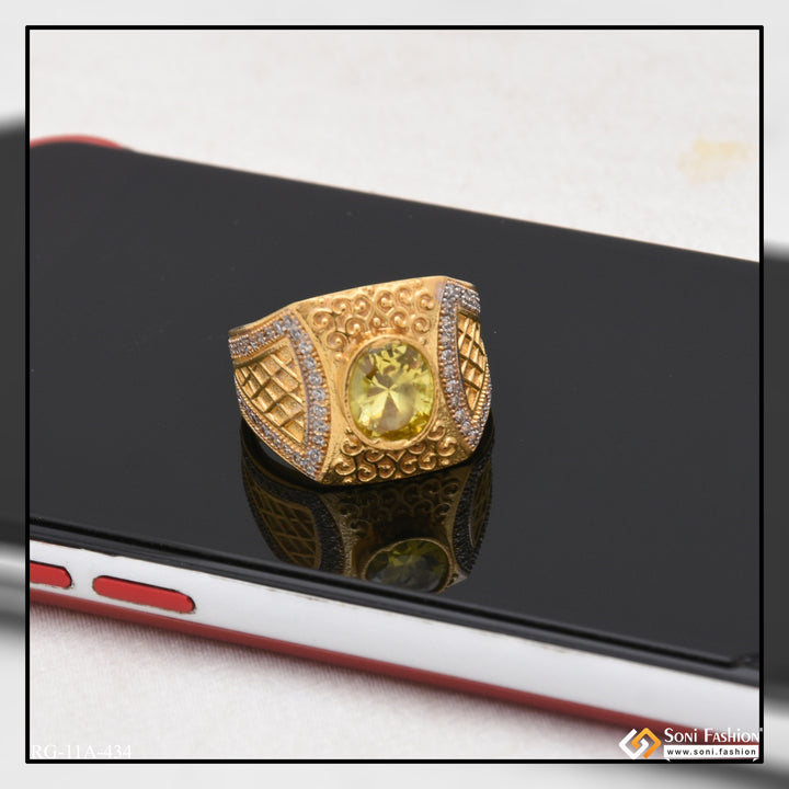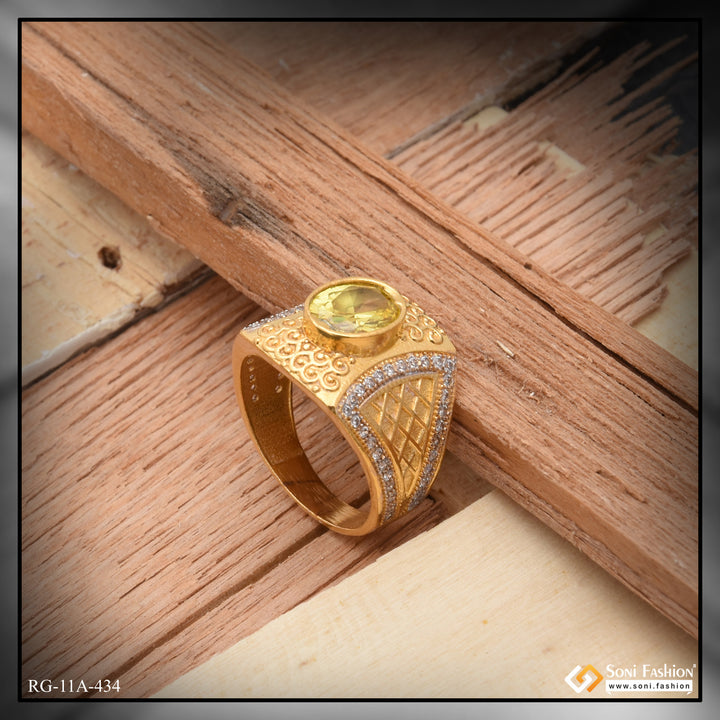 This 1 Gram Gold Forming Yellow Stone with Diamond Delicate Design Ring features a textured yellow stone shining with royal rhodium and miligram gold for a unique and stylish look. Expertly crafted for grooms, this timeless golden ring is the perfect union of form and function with sparkling diamonds and a brass base.