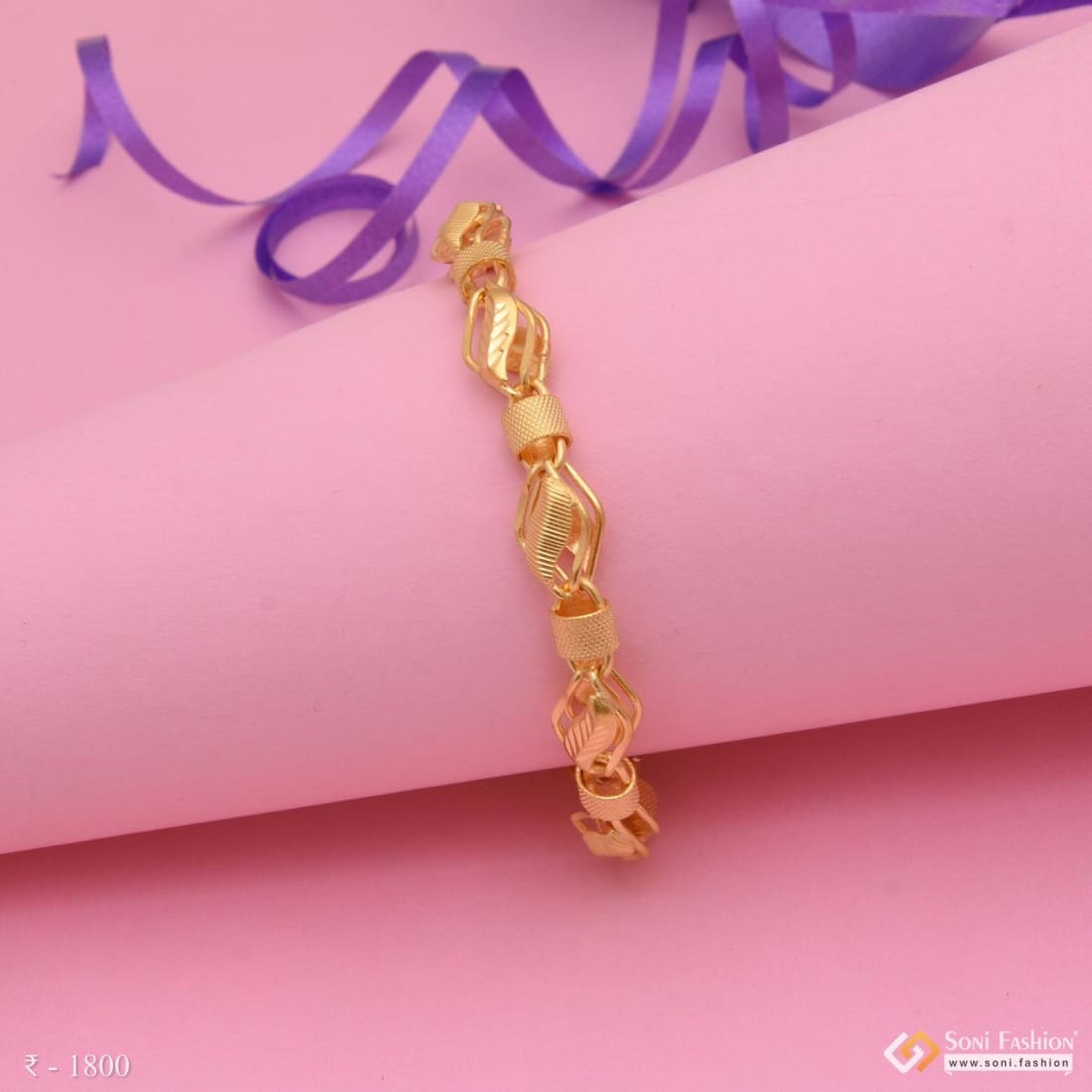 This magnificent 1 Gram Gold - Leaf in Kohli Fashionable Design Gold Plated Bracelet is handcrafted with precision for maximum sophistication. It is brass-based with a textured and shining finish, adorned with 1mg of gold. Perfect for special occasions, this timeless bracelet is an elegant choice for any day.