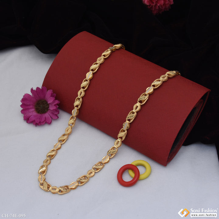 This 1 Gram Gold Plated Kohli Chain for men features a unique 2-in-1 design crafted from brass with a filigree pattern. Finished in a matt texture with rhodium shining accents, this golden chain measures 20 inches, combining style and durability for everyday wear.
