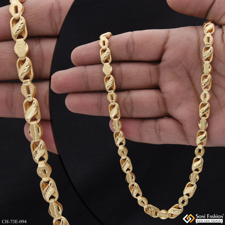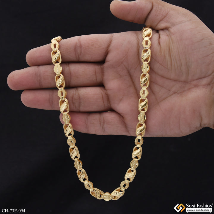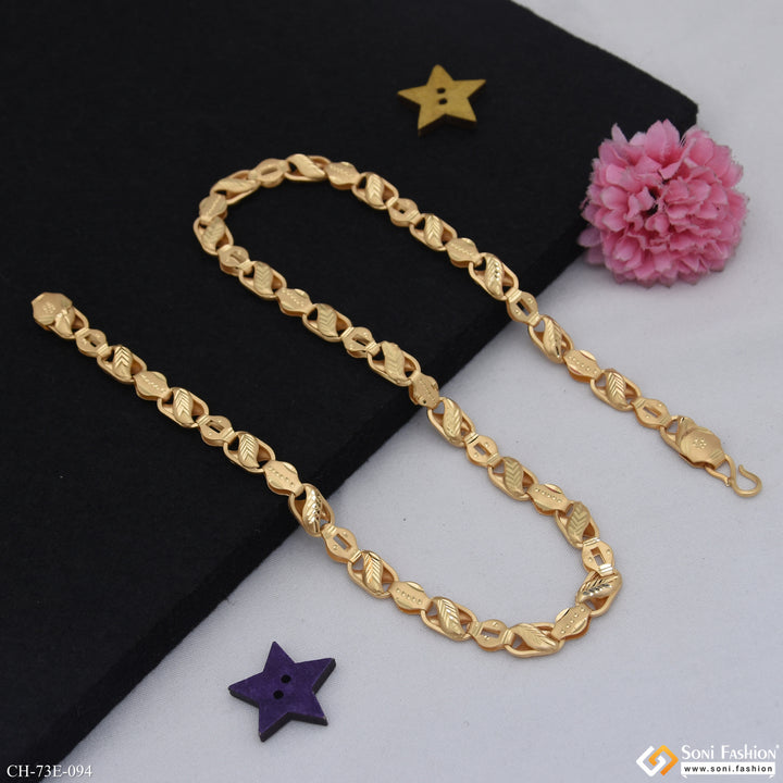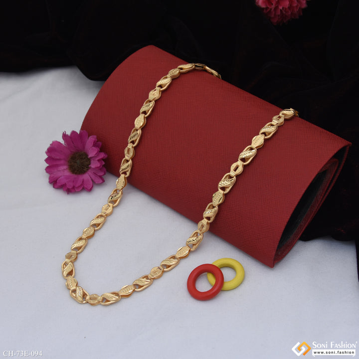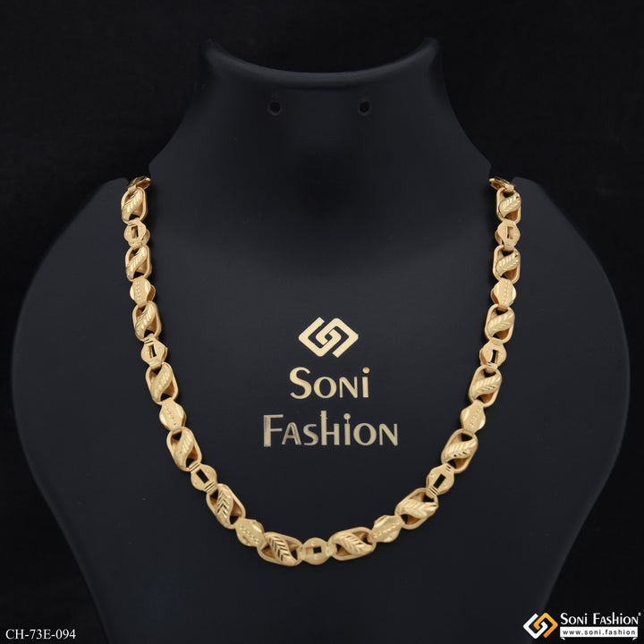 This 1 gram gold-plated Kohli chain combines style and durability with its 20-inch length and matt finish. Crafted from brass with a delicate filigree design, it offers a refined golden shine that complements any outfit. Perfect for men seeking an elegant yet affordable accessory, this versatile chain is a quality choice for everyday wear.