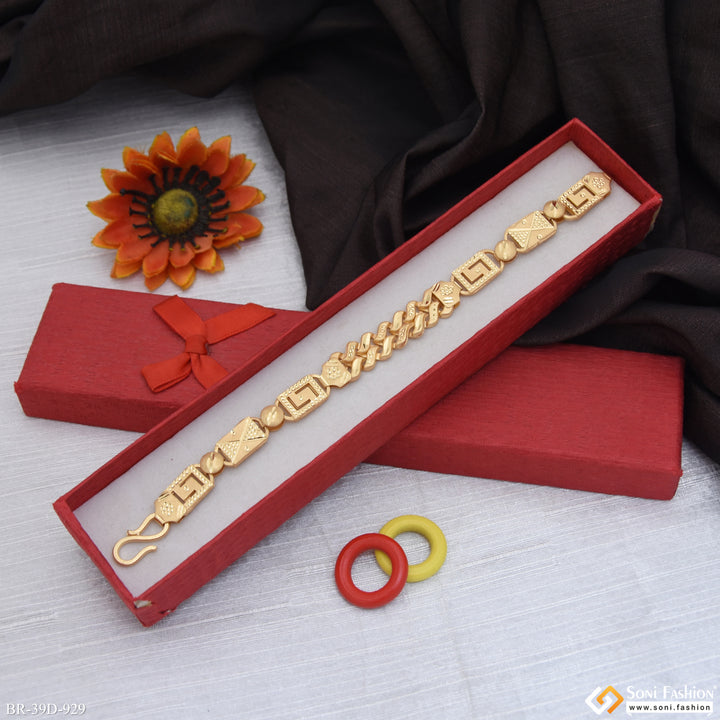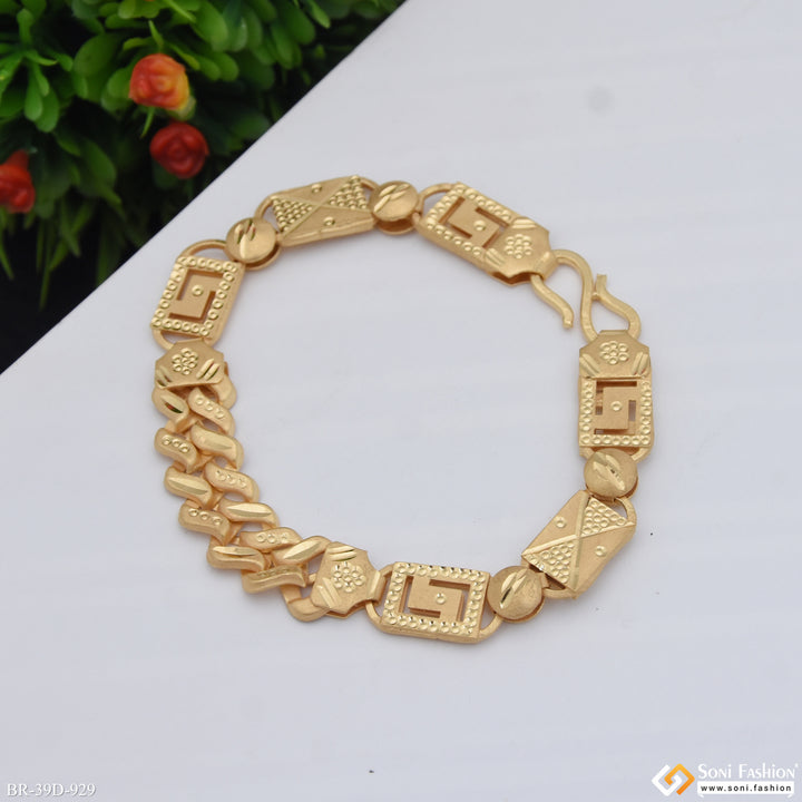 This 1 Gram Gold Plated Nawabi Pokal Bracelet combines elegance and tradition in a single accessory. Featuring a matt finish with an intricate filigree design, this hollow brass bracelet offers both style and comfort. Its 2-in-1 design makes it versatile for everyday wear or special occasions, adding a shining golden touch to any outfit. Perfectly crafted for men seeking classic sophistication with a modern edge.