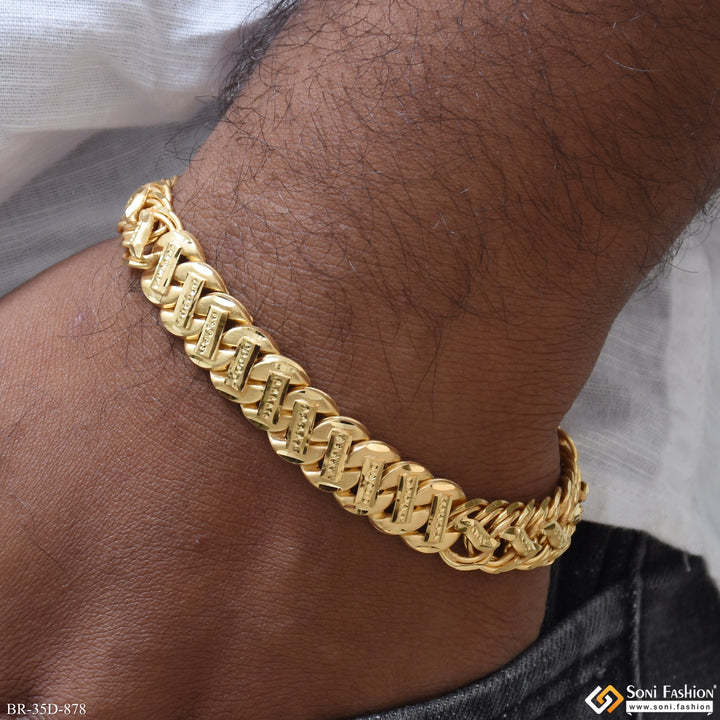 Elevate your style with this 1 Gram Gold Plated 2-In-1 Pokal Bracelet for Men. Crafted from durable brass with a shining miligram gold finish, this versatile link bracelet doubles as a hollow and regular bracelet, offering a unique blend of elegance and ruggedness. Perfect for everyday wear, it adds a subtle golden touch to any outfit while ensuring comfort and long-lasting quality.