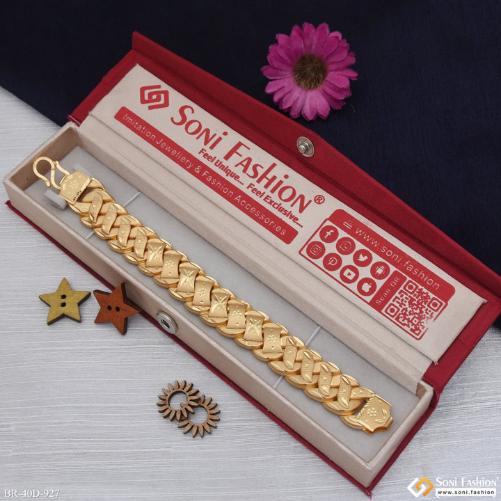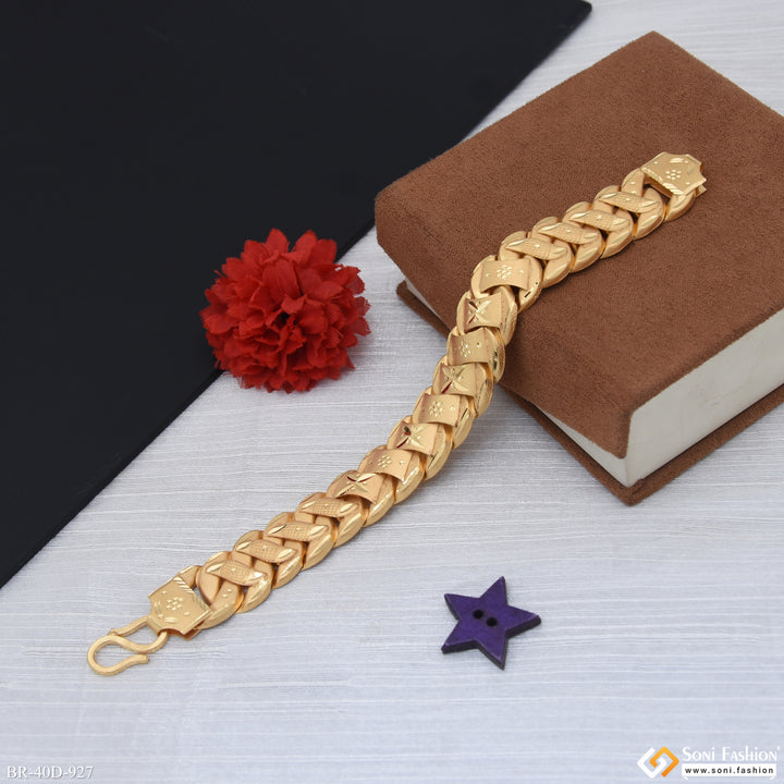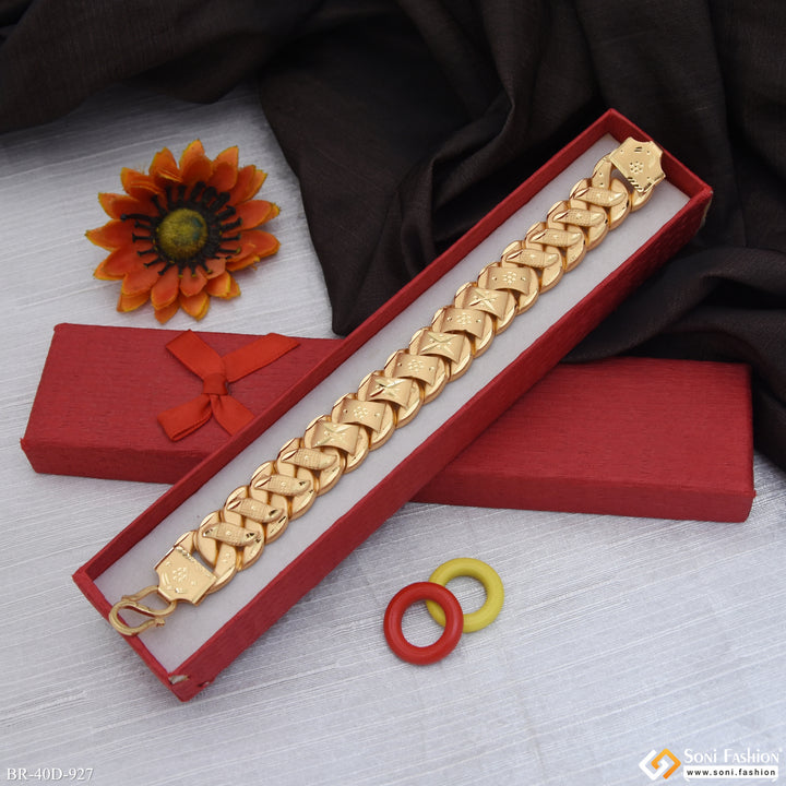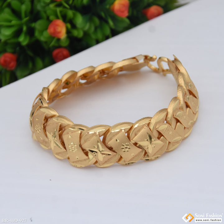Elevate your style with this 1 Gram Gold Plated 2 In 1 Pokal Bracelet for Men, featuring a broad hollow brass design with intricate filigree work. The matt finish adds a subtle sophistication, making it ideal for daily wear or special occasions. Durable yet lightweight, this versatile bracelet blends traditional craftsmanship with modern aesthetics for a unique accessory.