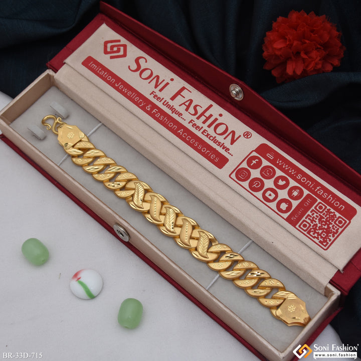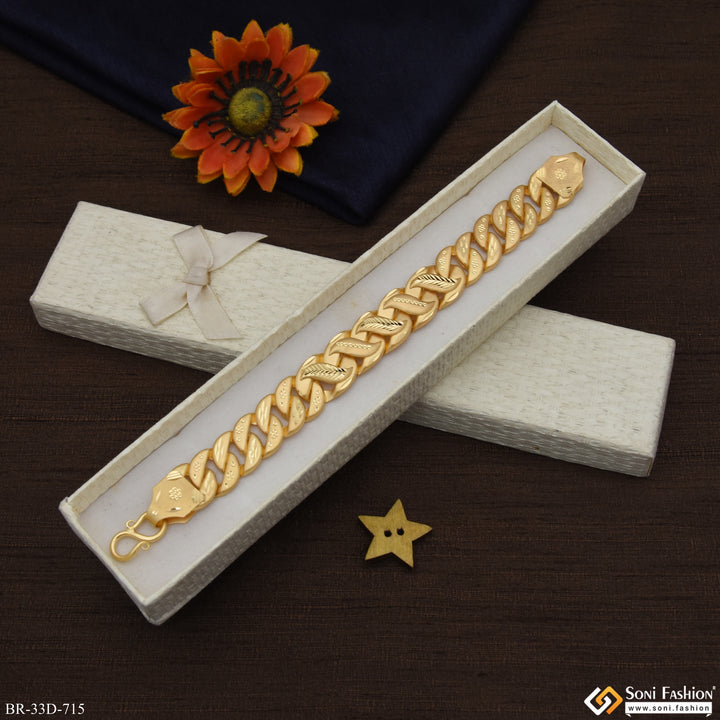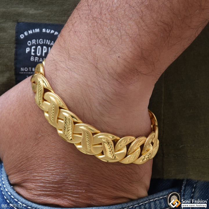 This 1 gram gold-plated Pokal bracelet for men features a royal, shining matt finish with a hollow design crafted from brass. Its intricate filigree pattern adds a touch of elegance, making it a stylish and lightweight accessory for everyday wear. Perfect for those seeking a unique golden bracelet with a regular fit.