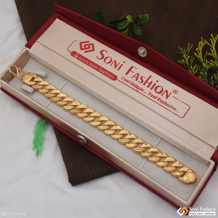 This 1 Gram Gold Plated Pokal Bracelet for men features a matt finish with a hollow design, crafted from durable brass. Its lightweight construction ensures comfortable wear throughout the day while adding a stylish golden touch to any outfit. Perfect for regular use, this eye-catching bracelet combines elegant design with lasting quality.