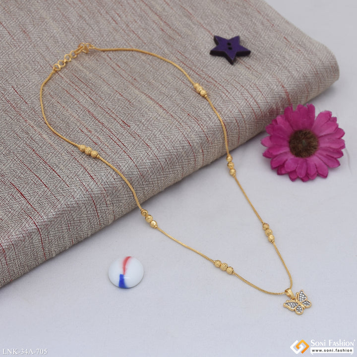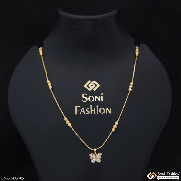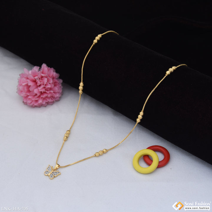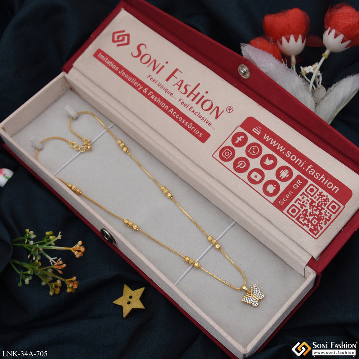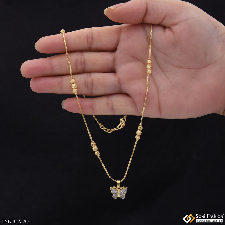 Elevate your everyday elegance with this stunning 1 gram gold-plated chain pendant, featuring an exquisite butterfly design crafted from quality brass. The rhodium-enhanced finish delivers a brilliant, long-lasting shine that catches...
