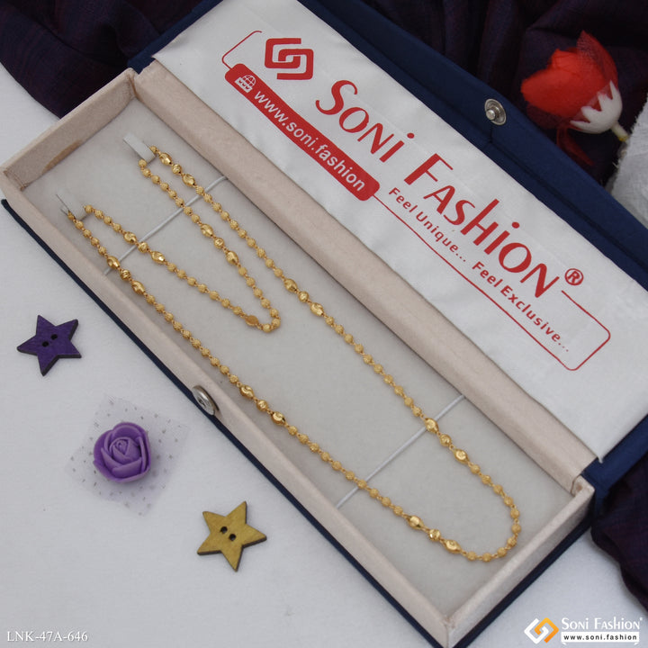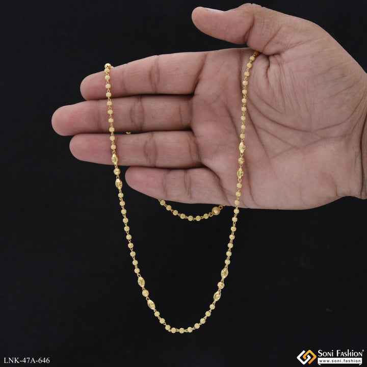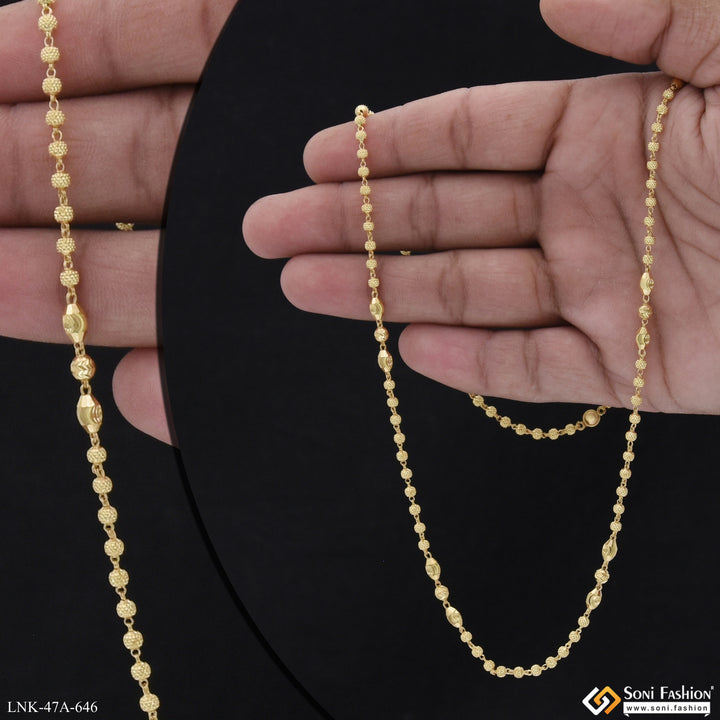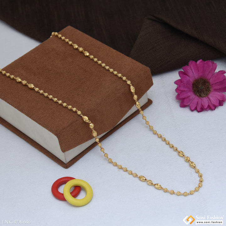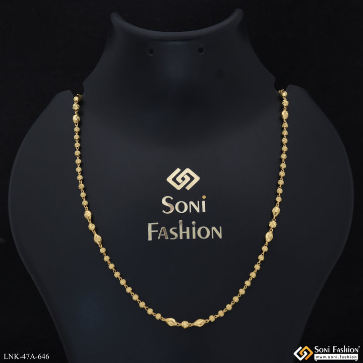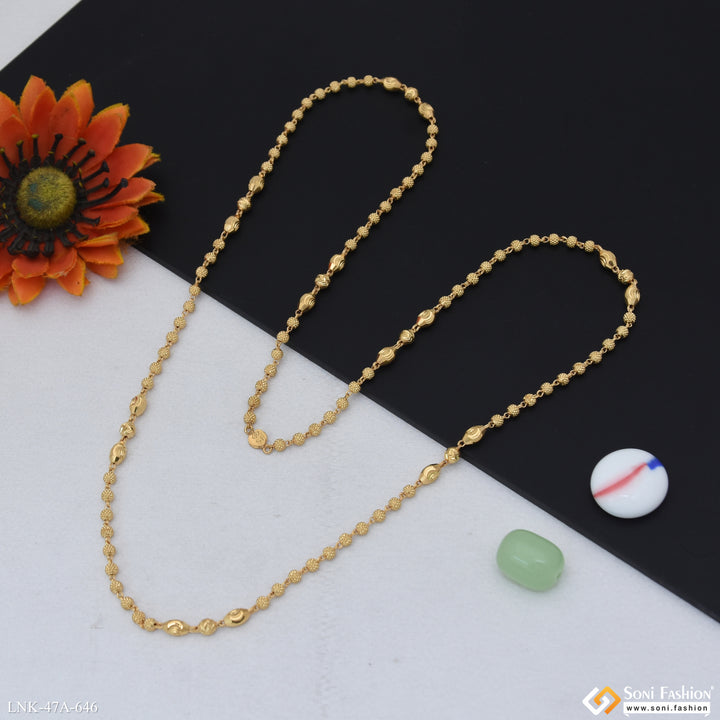 This 1 gram gold-plated brass mala necklace features a delicate filigree design with elegant beads, offering a radiant golden finish. Lightweight and stylish, it’s perfect for adding a subtle shine to any outfit while maintaining comfort for all-day wear. Ideal for women seeking a blend of traditional charm and modern appeal.