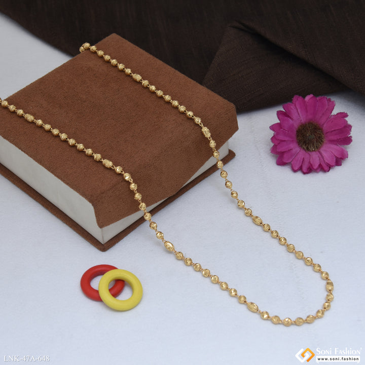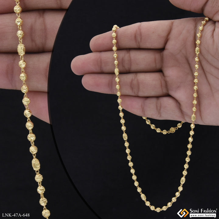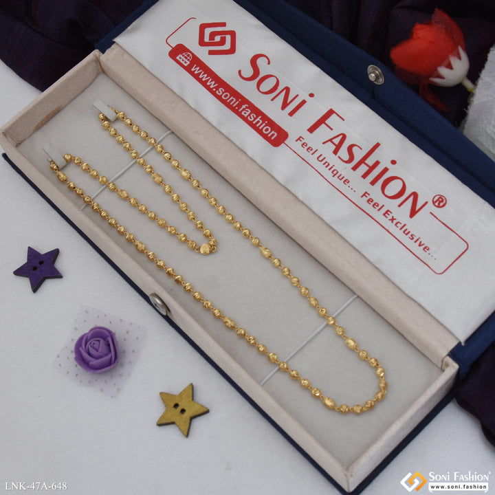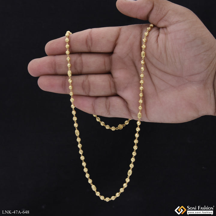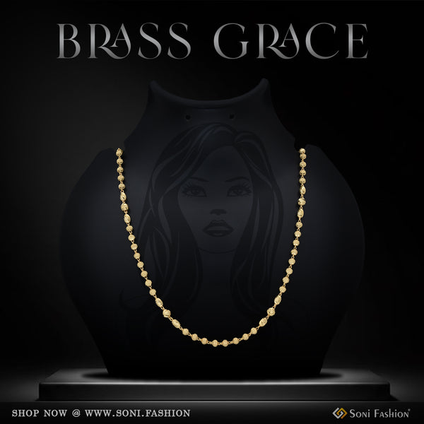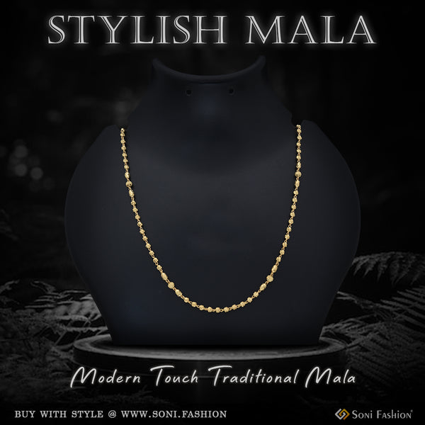 This 1 gram gold-plated brass mala necklace features a delicate filigree design with elegant beads, offering a radiant golden finish. Lightweight and stylish, it adds a subtle shine to any outfit, perfect for everyday wear or special occasions. Crafted with attention to detail, this mala combines traditional charm with modern appeal.