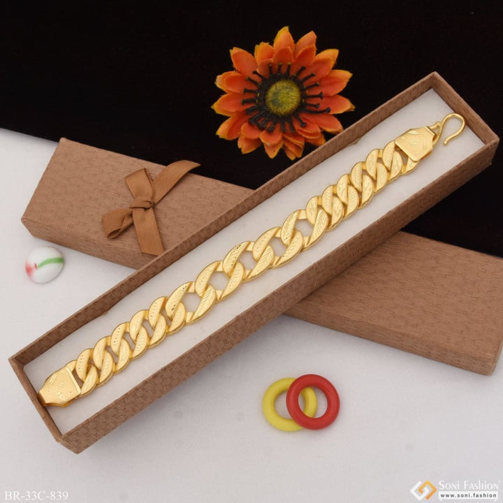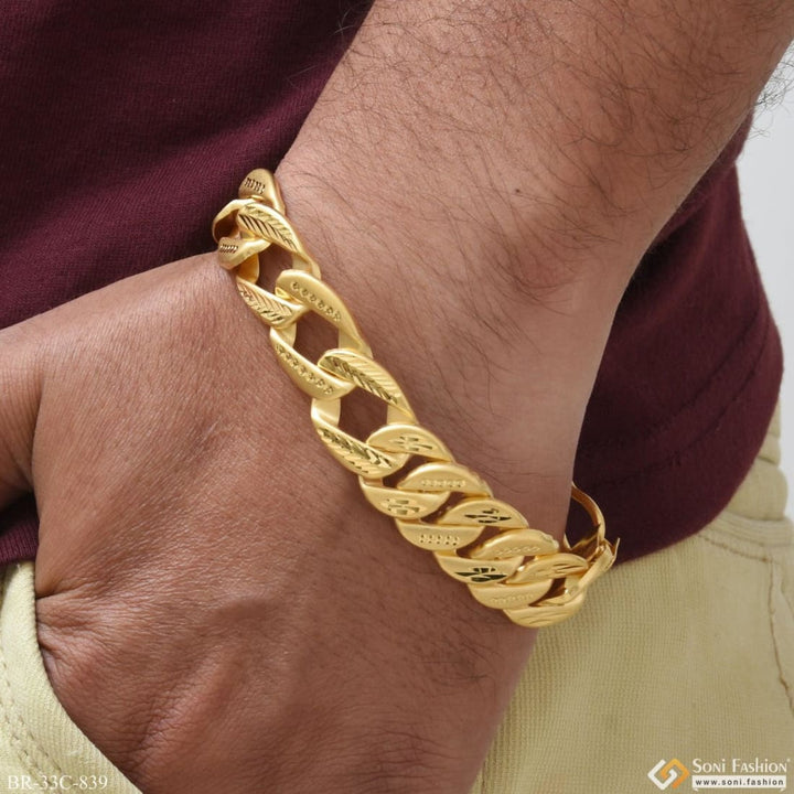 This 1 Gram Gold Plated Pokal Chic Design Superior Quality Bracelet for Men is the perfect accessory to add a touch of glamour to any outfit. With its stylish and shining royal design, high-quality miligram gold, matt hollow bracelet, and cool filigree design, this golden bracelet stands out in the crowd. It's sure to make a statement.