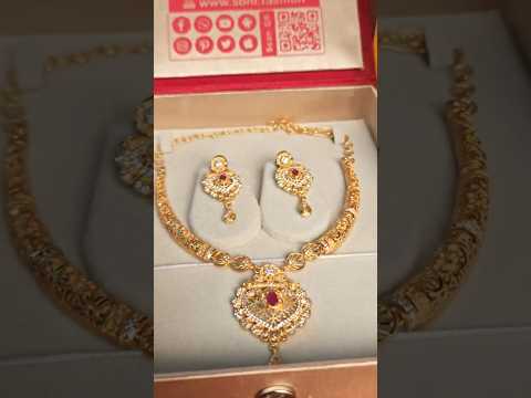 This 1 gram gold plated necklace set features a shining royal pink design, perfect for adding a touch of elegance to any outfit. Its miligram gold plating and filigree design make...