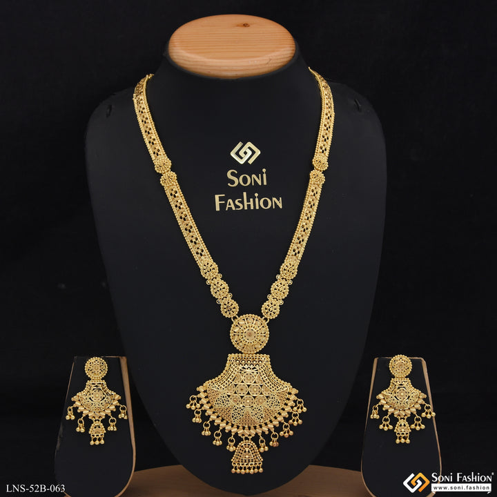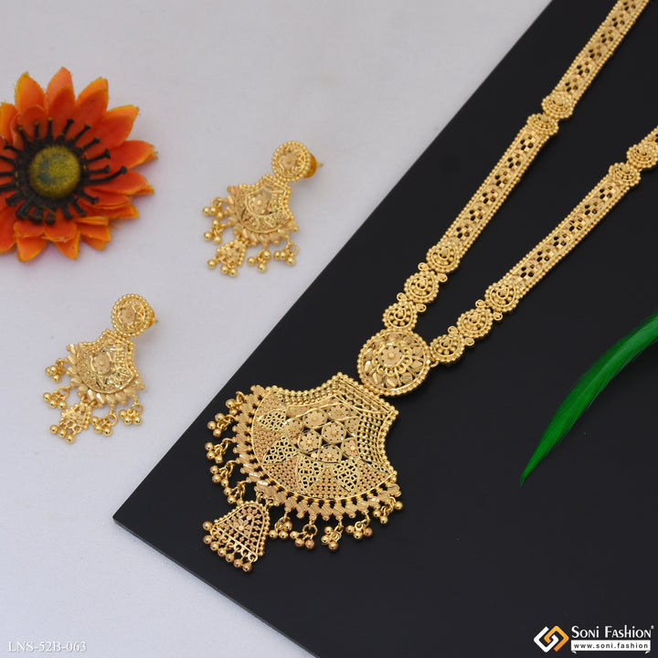 Add a touch of elegance to your outfit with our 1 Gram Gold Plated Necklace Set for Women. Crafted with filigree design and featuring a stunning matte finish, this set is perfect for any occasion. Made with high-quality brass, it shines like real gold, adding a royal touch to your look. Stay on trend with this dazzling necklace set.
