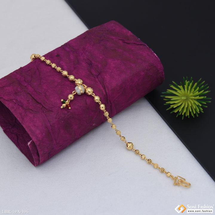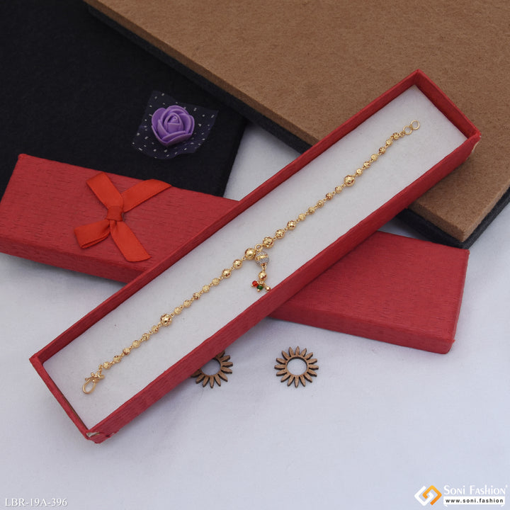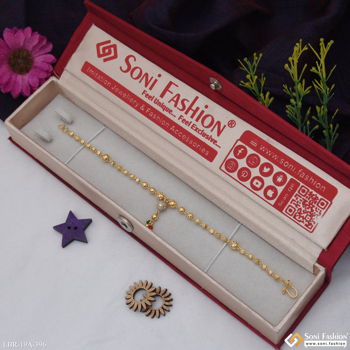 Elevate your style with this 1 gram gold plated designer bracelet for ladies. Crafted with a shining rhodium finish, this bracelet blends elegance with the latest trends. Available in vibrant red, green, and classic golden hues, it is made from durable brass and features miligram-level gold plating for a refined look. Perfect for adding a subtle touch of glamour to any outfit, this bracelet is a versatile accessory for everyday wear or special occasions.