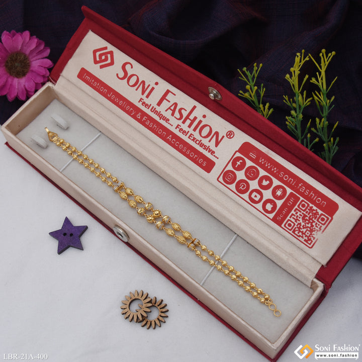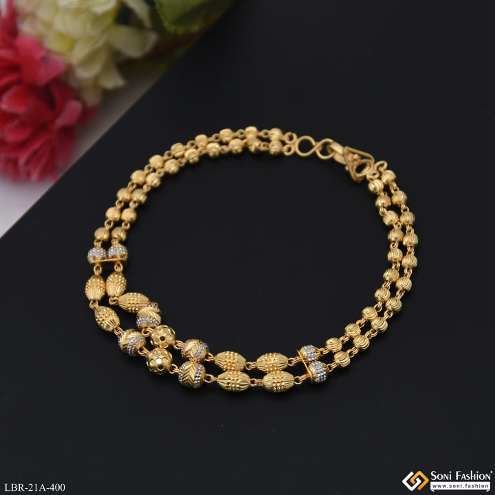 This exquisite 1 Gram Gold Plated Ladies Bracelet features a stylish two-line design crafted from durable brass with a shining rhodium finish. Lightweight and elegant, it adds a subtle golden glow to any outfit, perfect for everyday wear or special occasions. Its exclusive design enhances your wrist with timeless charm and sophistication.