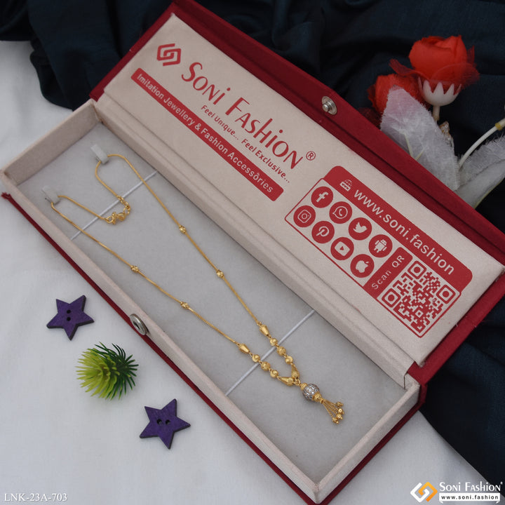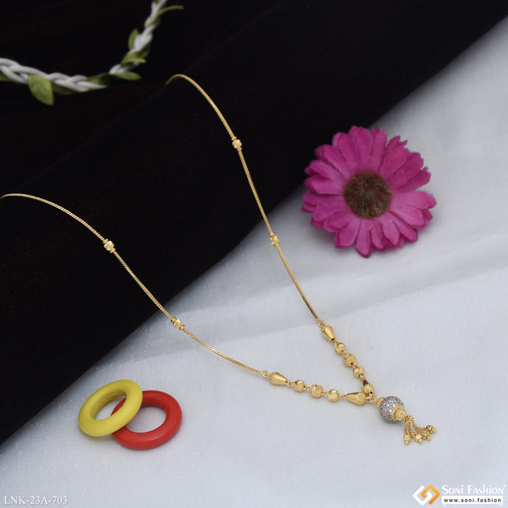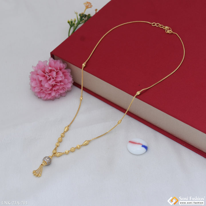 This 1 gram gold-plated necklace features a fancy design combining shining brass with diamond-like accents for a luxurious look. Lightweight and elegant, it adds a subtle golden glow to any outfit, perfect for everyday wear or special occasions.