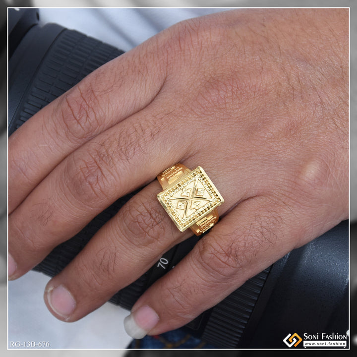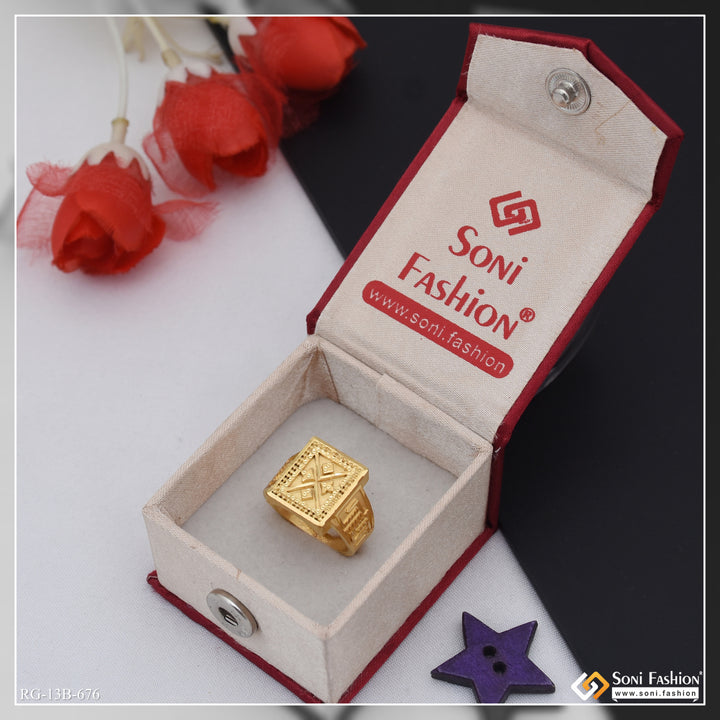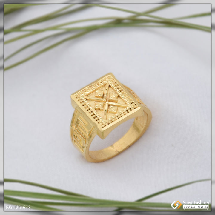 This stylish men's ring features a royal rectangular design with intricate filigree work, crafted from brass and plated with 1 gram of matt miligram gold. Its golden finish adds a subtle shine, making it a perfect accessory for a sophisticated yet understated look. Durable and elegant, this ring complements both casual and formal attire.