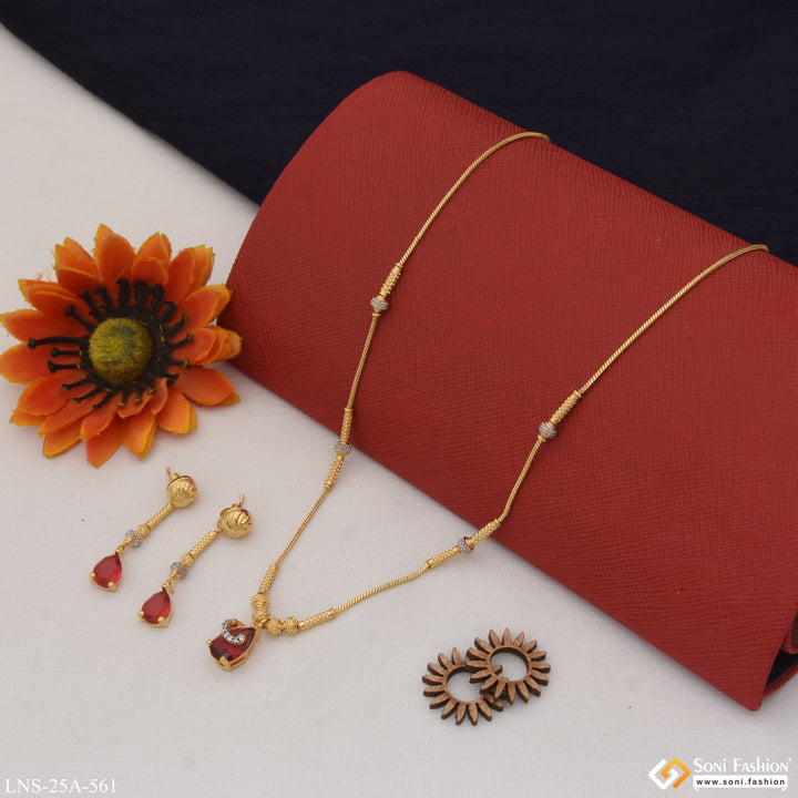 This stunning necklace set features a textured, shining red design with a royal touch. Crafted with 1 gram of gold plating and adorned with sparkling diamonds, it is the perfect accessory...