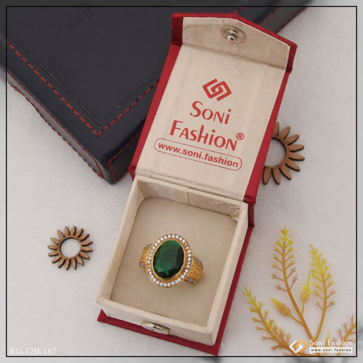 1 Gram Gold Plated Green Stone with Diamond Best Quality Ring for Men - Style B187