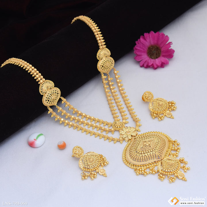 Experience the royal and elegant style with our 1 Gram Gold Plated High-Class Necklace Set. This long set features a shining finish and intricate filigree design, crafted with high-quality brass material. Stay on trend with the latest fashion and shine like pure gold with this beautiful necklace set.