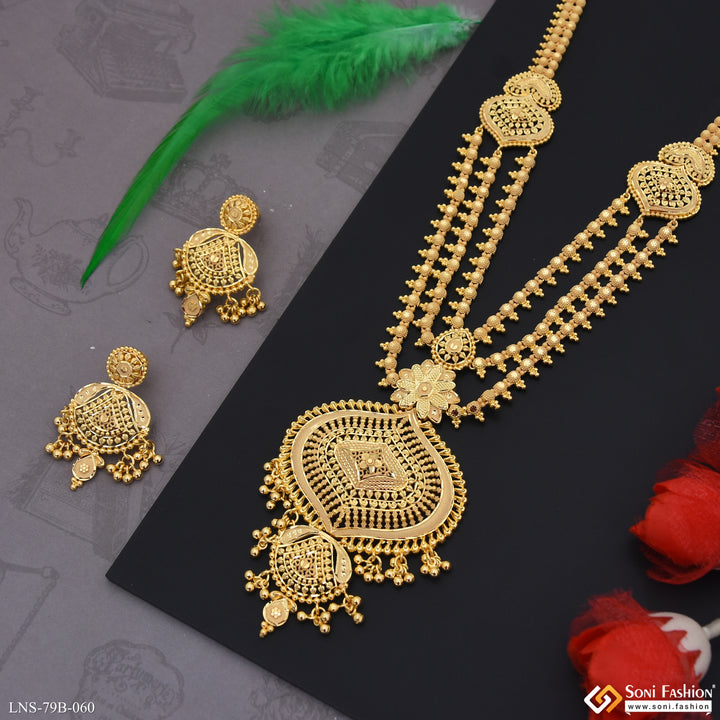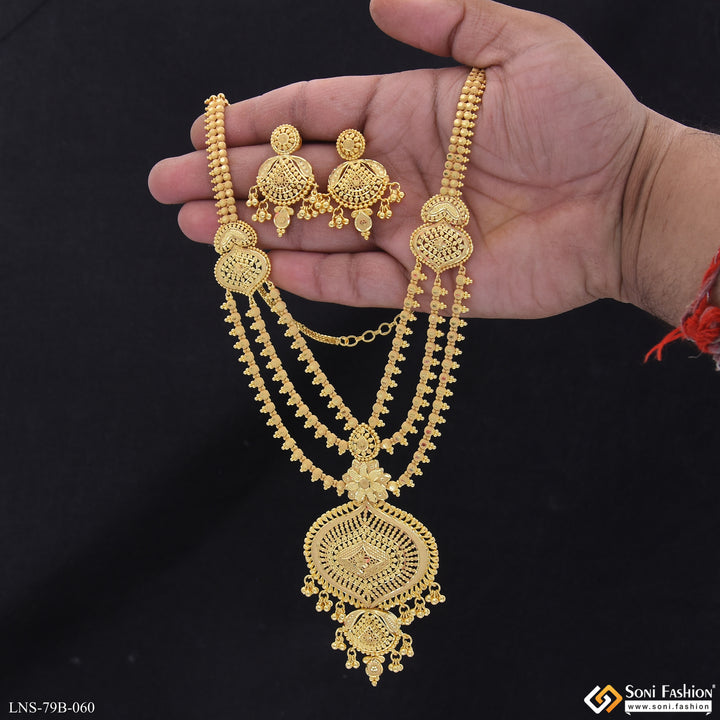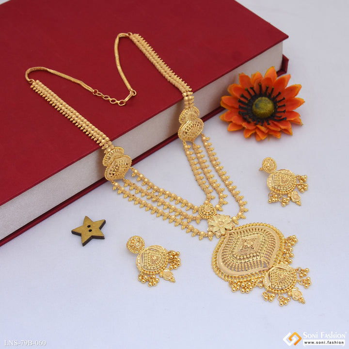 Experience the royal and elegant style with our 1 Gram Gold Plated High-Class Necklace Set. This long set features a shining finish and intricate filigree design, crafted with high-quality brass material....