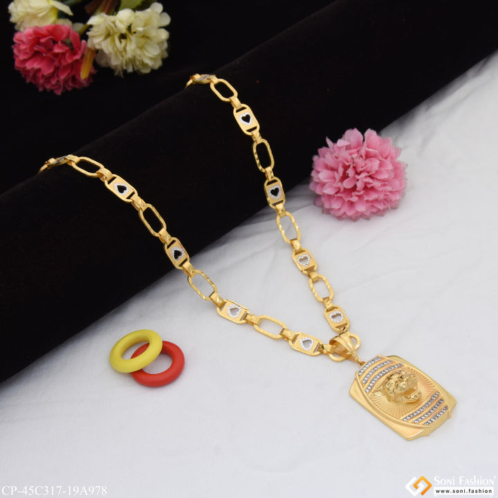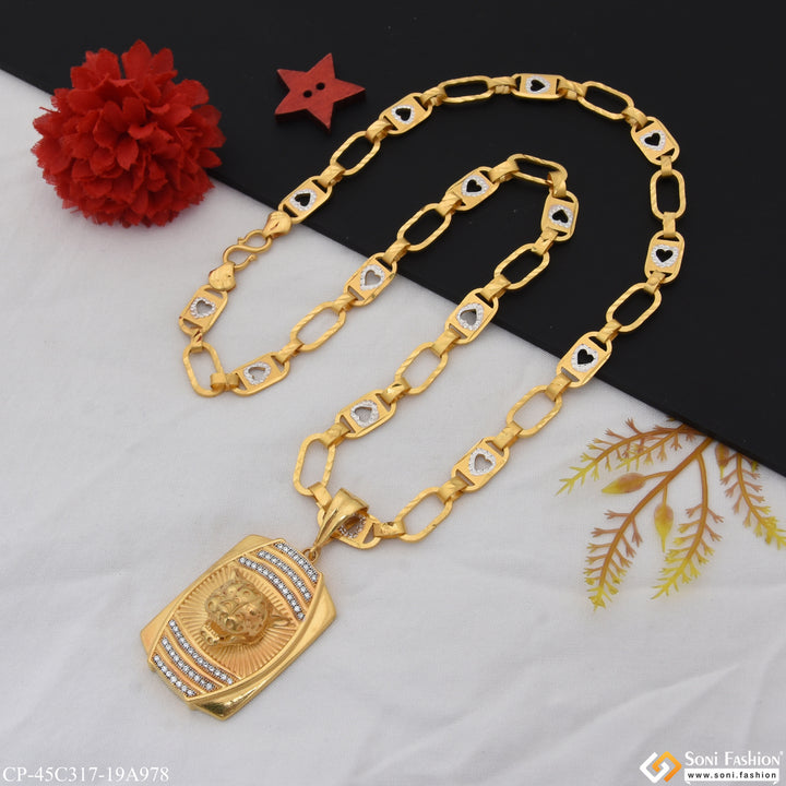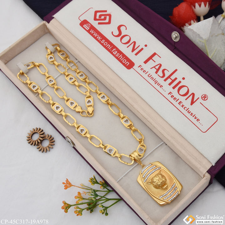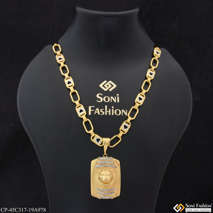 Experience the opulence of royalty with our 1 Gram Gold Plated Jaguar Trending Design Chain Pendant Combo for Men. The unique texture and shining rhodium plating on this handmade pendant exude a regal charm, while the heart-shaped diamond adds a touch of luxury. Perfect for grooms and fashion-forward individuals, complete your look with this golden Nawabi chain for a sophisticated touch.