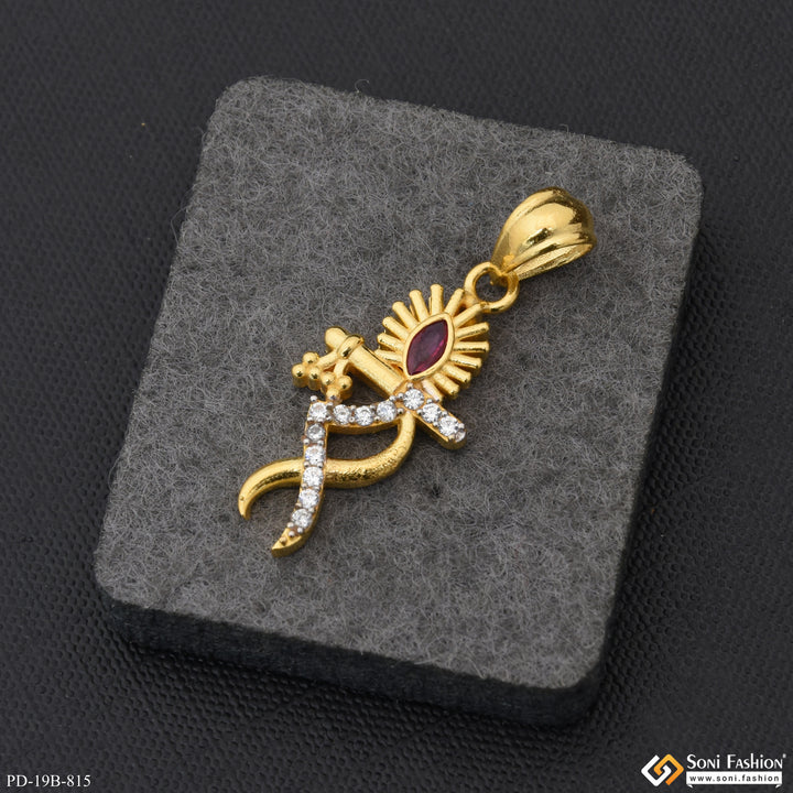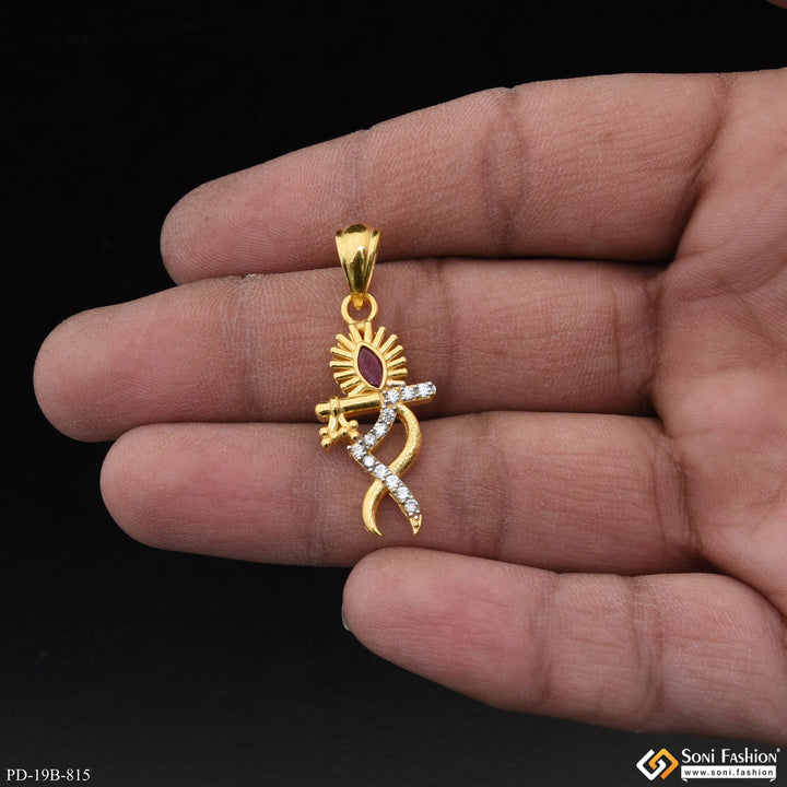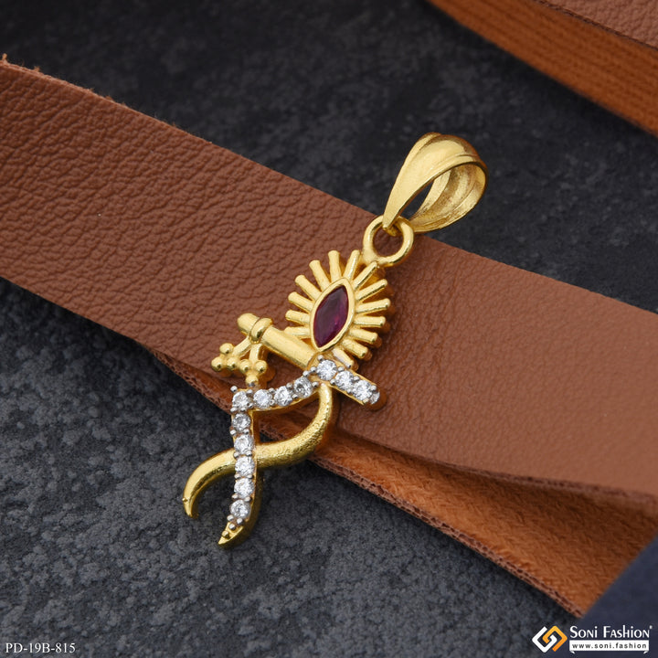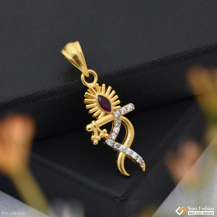 This 1 gram gold plated pendant for men showcases a royal design of Lord Krishna. Adorned with a shining pink stone and a diamond, this religious piece showcases the best quality craftsmanship in brass material with a miligram gold finish. A must-have for any devotee or lover of intricate jewelry.