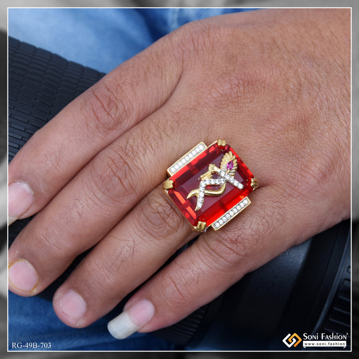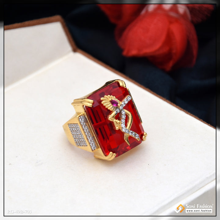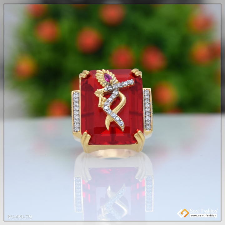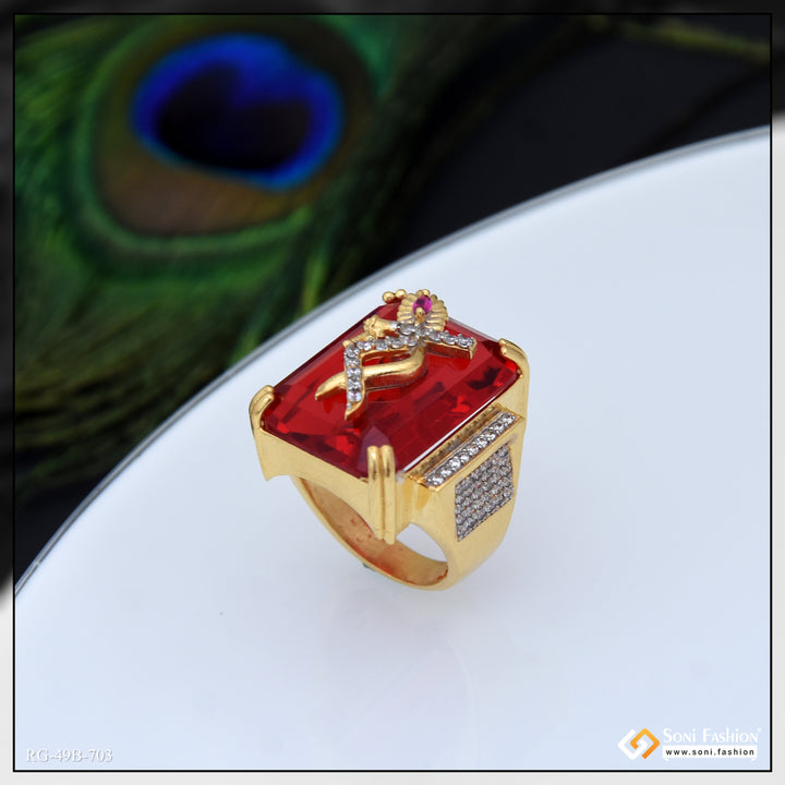 1 Gram Gold Plated Krishna On Red Stone Awesome Design Ring for Men - Style B703
