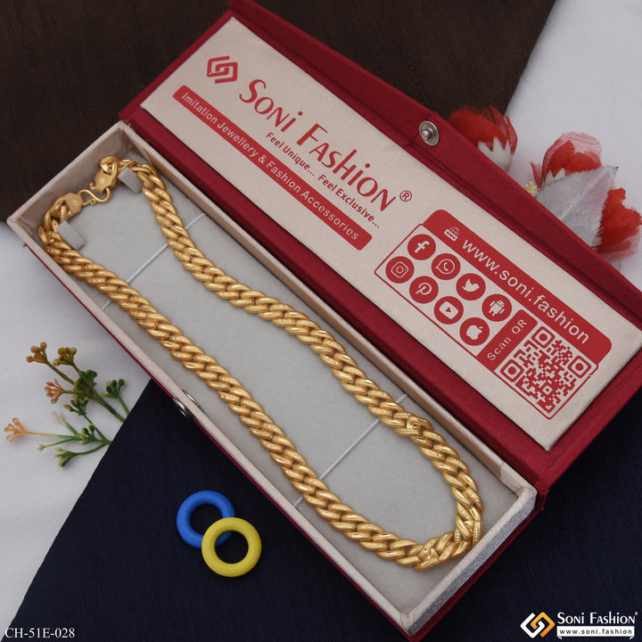 This 21-inch Pokal chain features a stylish hollow design crafted from brass with a matt finish and a shining gold plating of 1 gram. Its lightweight and elegant look make it a perfect accessory for men seeking a modern yet classic golden chain. Durable and comfortable, it complements various outfits with subtle sophistication.