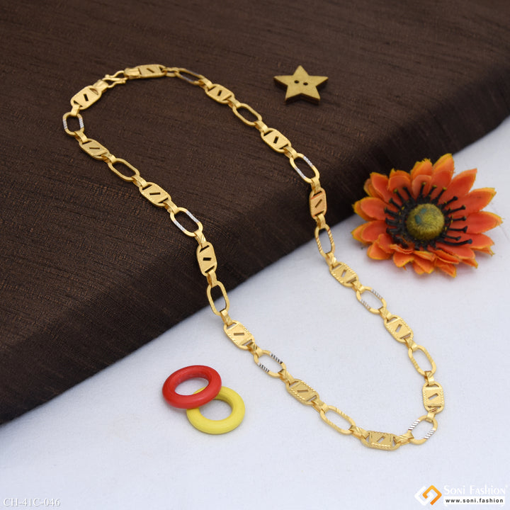 This 1 Gram Gold Plated Line Nawabi Designer Design Best Quality Chain is perfect for the jewelry enthusiast. Crafted from a combination of brass and miligram gold, this 20-inch chain features a textured, shining, Nawabi design that is sure to dazzle. The perfect addition to any outfit!