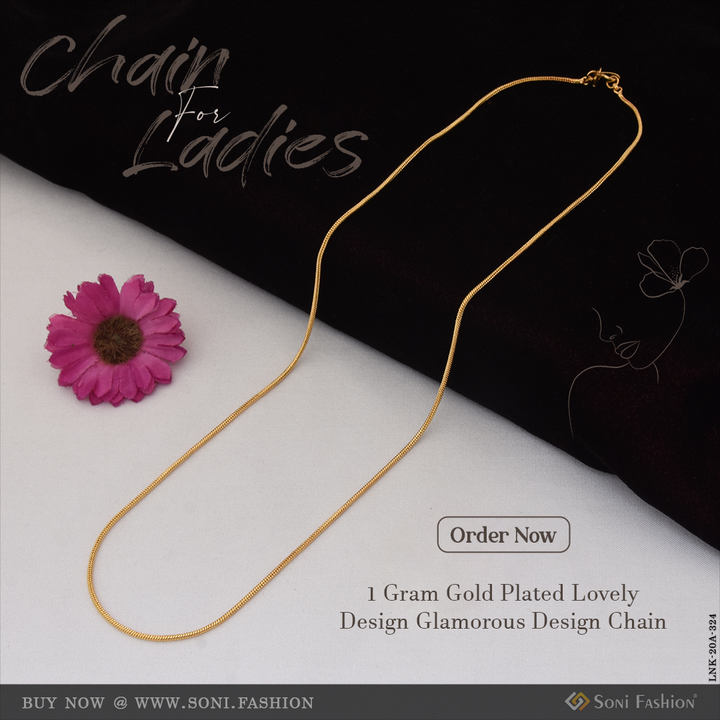 Experience elegance with this 1 gram gold plated ladies chain featuring a glamorous, trendy design. Crafted from durable brass and finished with a rich golden hue, it offers both style and lasting shine. Perfect for adding a touch of sophistication to any outfit.