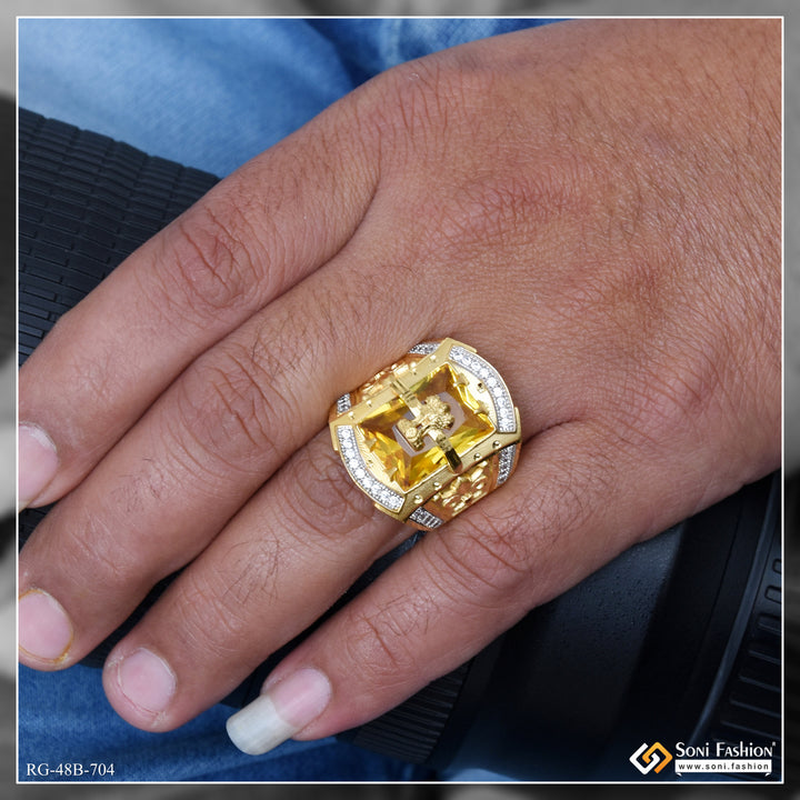 Elevate your style with this exquisite 1 gram gold-plated Mudra ring, crafted from premium brass with rhodium finishing. Featuring a stunning yellow stone centerpiece with diamond accents, this Rajwadi-inspired design combines traditional elegance with contemporary flair. Perfect for men seeking a statement piece that blends cultural heritage with modern aesthetics.