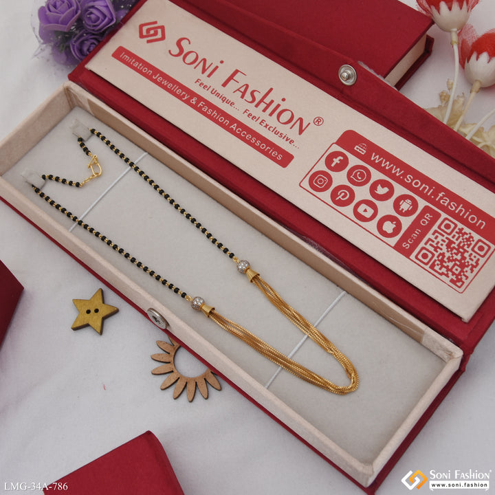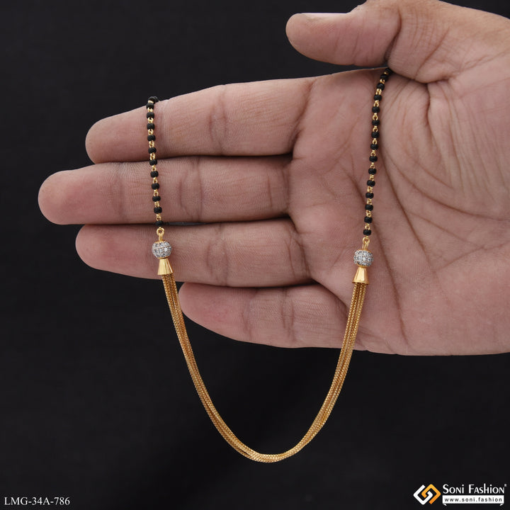 This 1 gram gold-plated mangalsutra features an opulent design with a shining rhodium finish and a single line of black moti beads. Crafted with brass and accented with diamond-like details, it offers a stylish and elegant accessory for women that combines traditional charm with contemporary appeal.