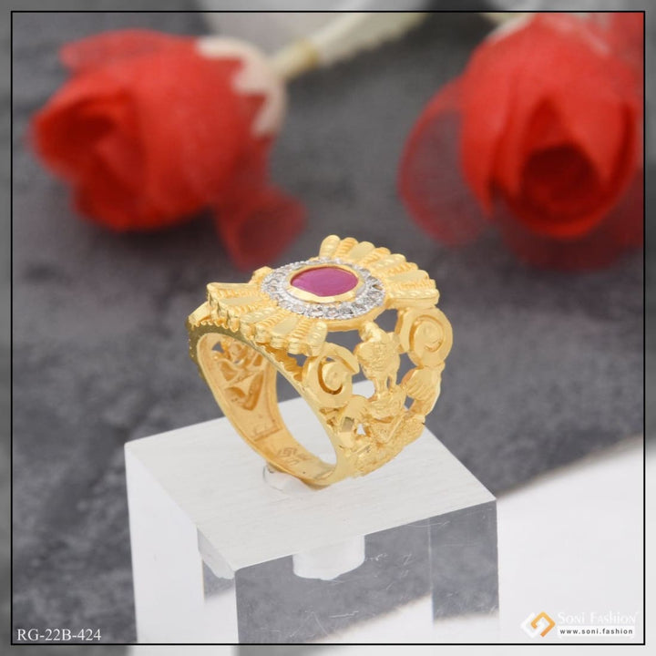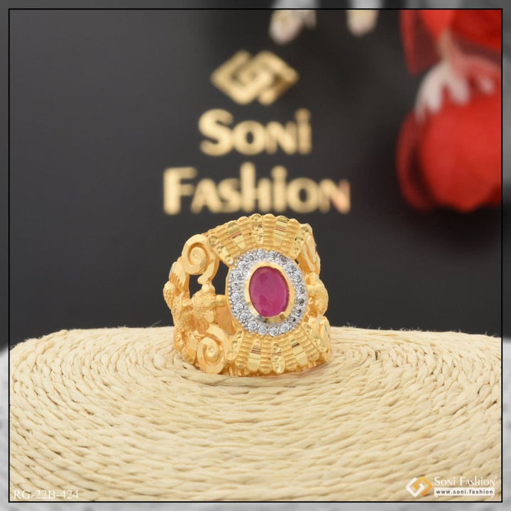 1 Gram Gold Plated Pink Stone with Diamond Amazing Design Ring for Men - Style B424