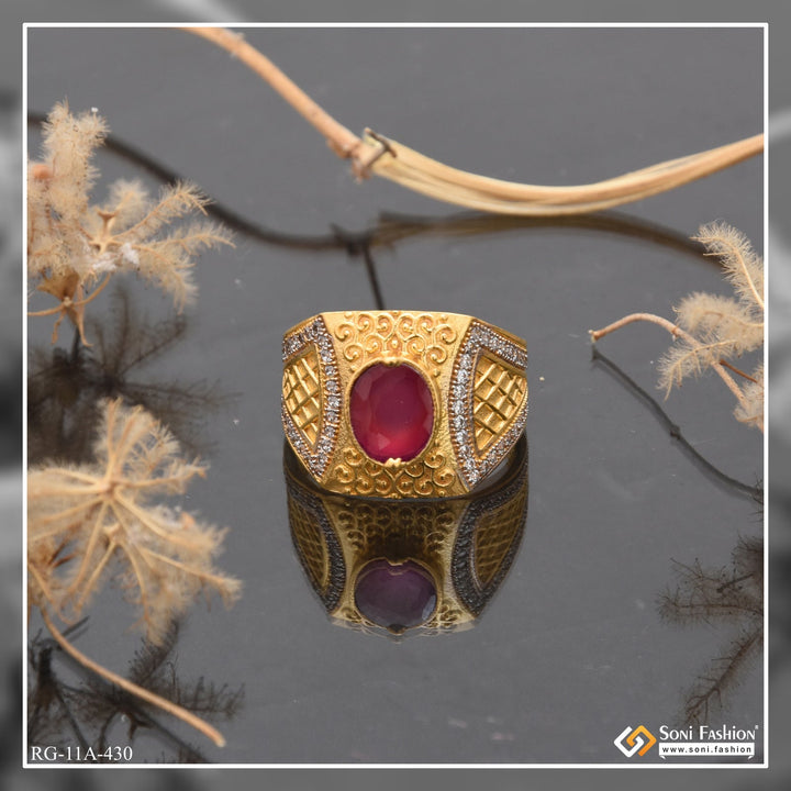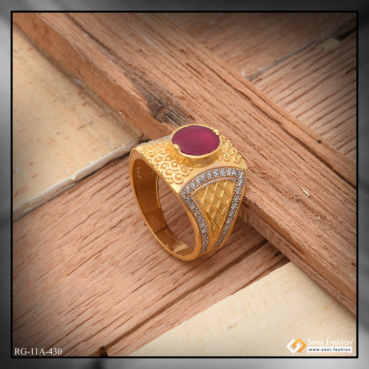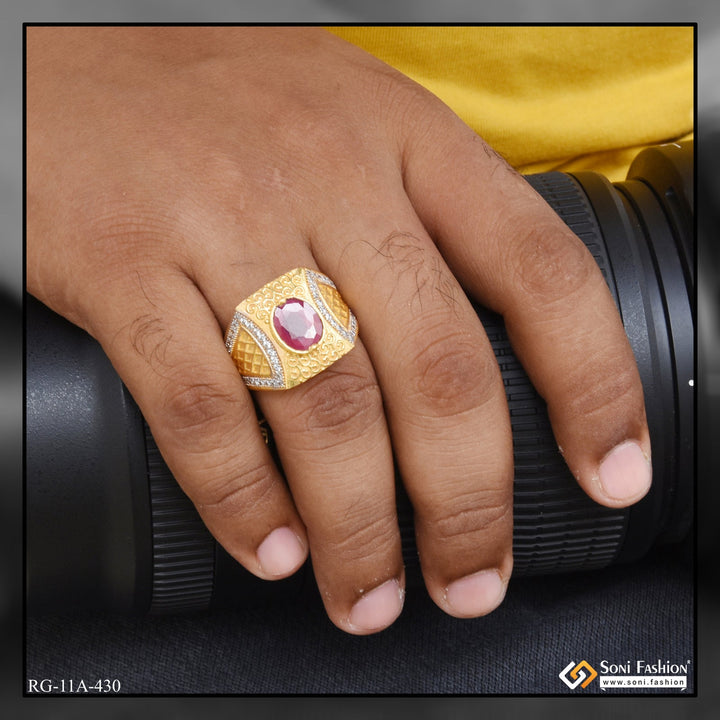 1 Gram Gold Plated Pink Stone With Diamond Best Quality Ring For Men - Style A430