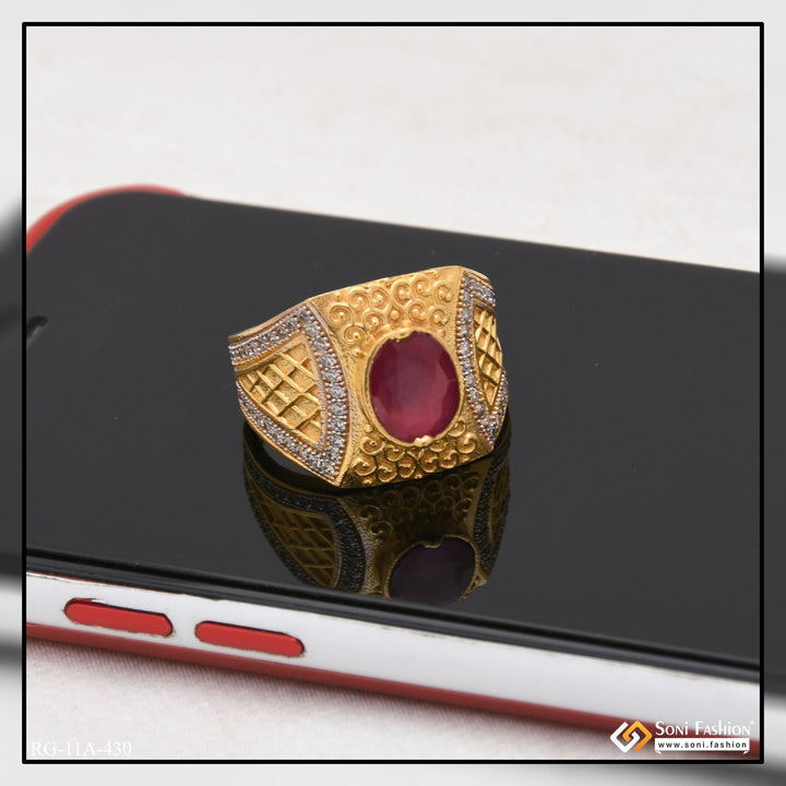 Elevate your style with our 1 Gram Gold Plated Pink Stone With Diamond Best Quality Ring for Men. The textured design exudes a regal charm, while the rhodium and brass materials add a touch of luxury. Experience the best of both worlds with the golden ring and diamond accents.