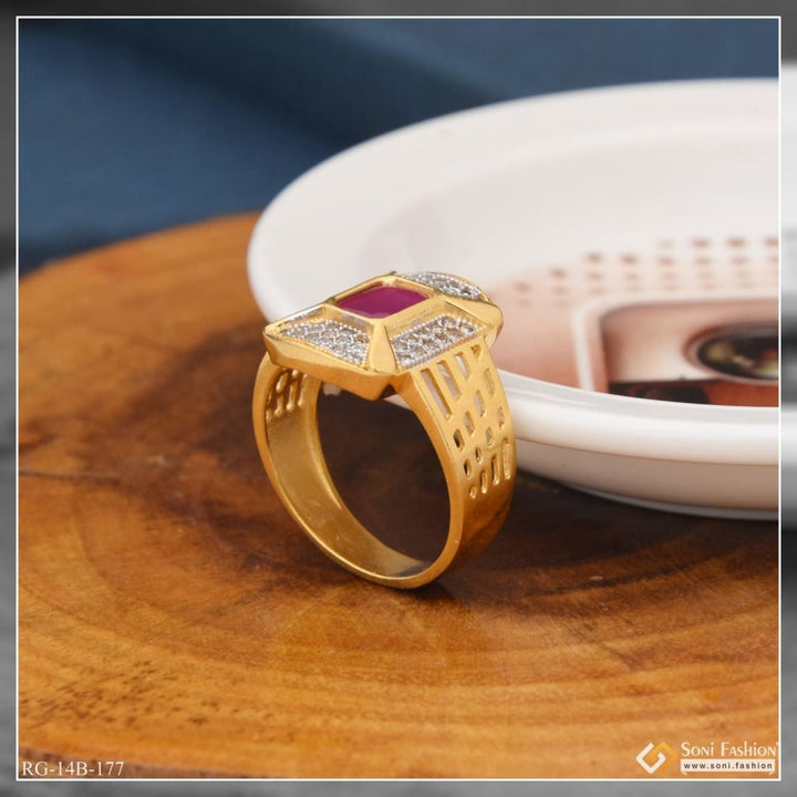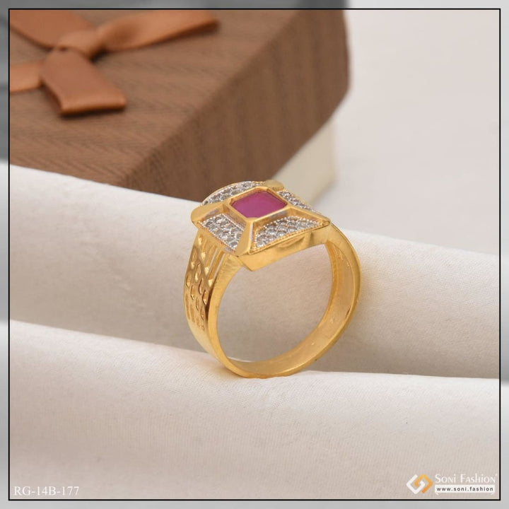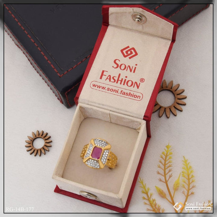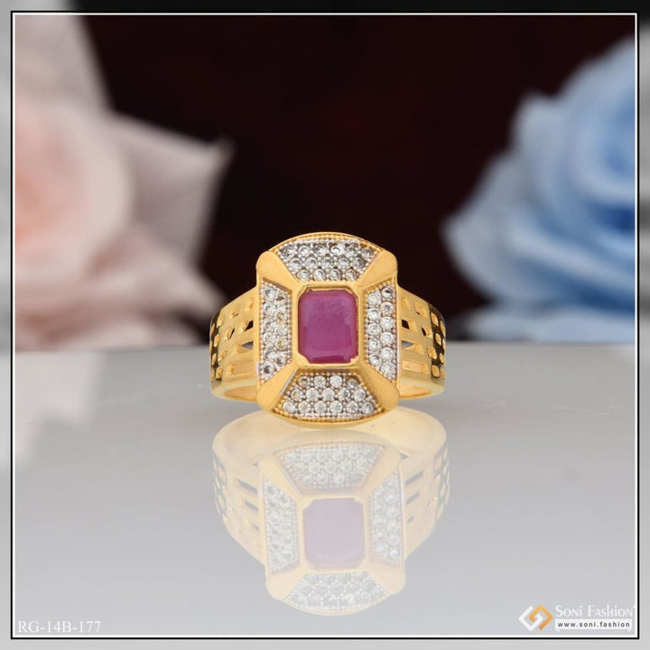 1 Gram Gold Plated Pink Stone with Diamond Best Quality Ring for Men - Style B177