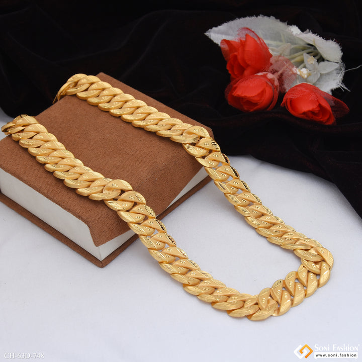 Expertly crafted for men, this 1 gram gold plated Rajwadi Pokal chain features a shining and matt finish with a unique filigree design. Made with high-quality brass, this hollow and broad...