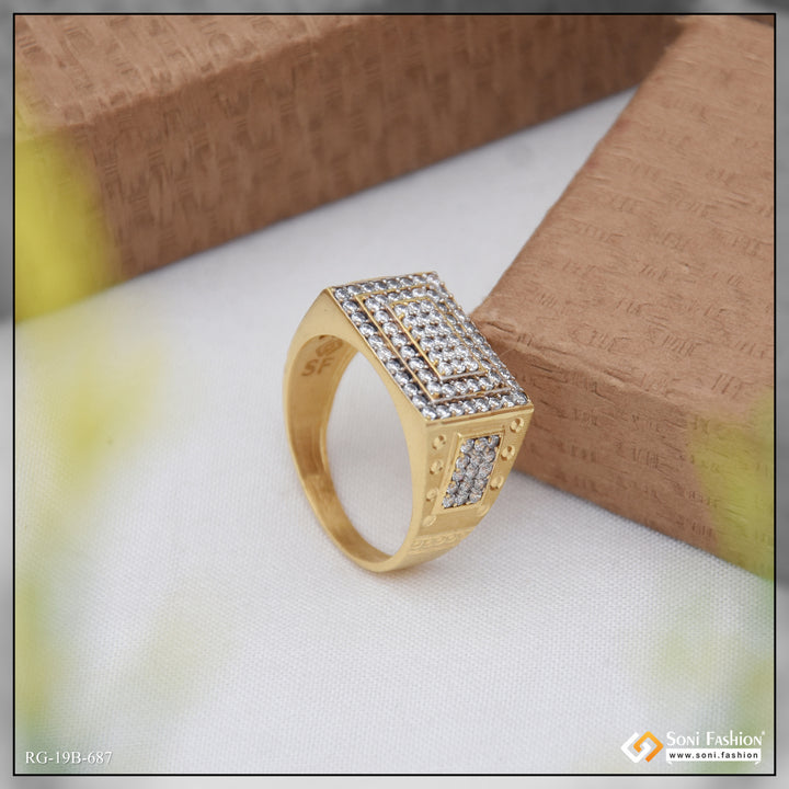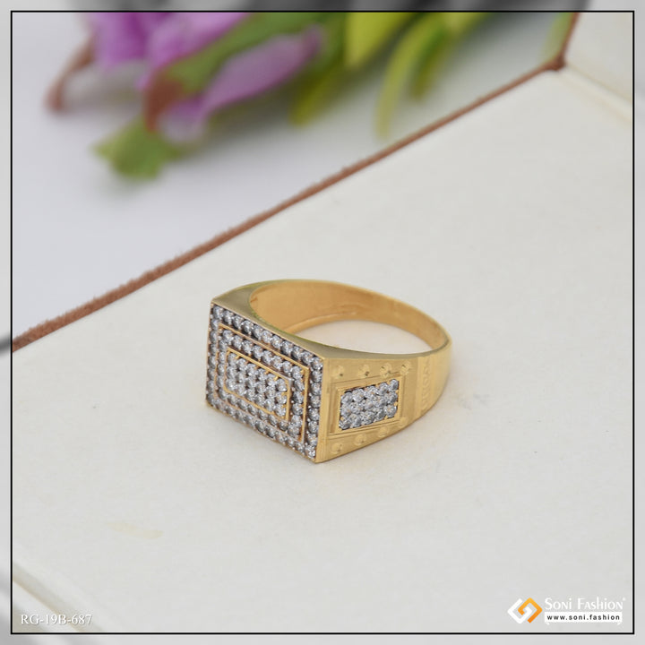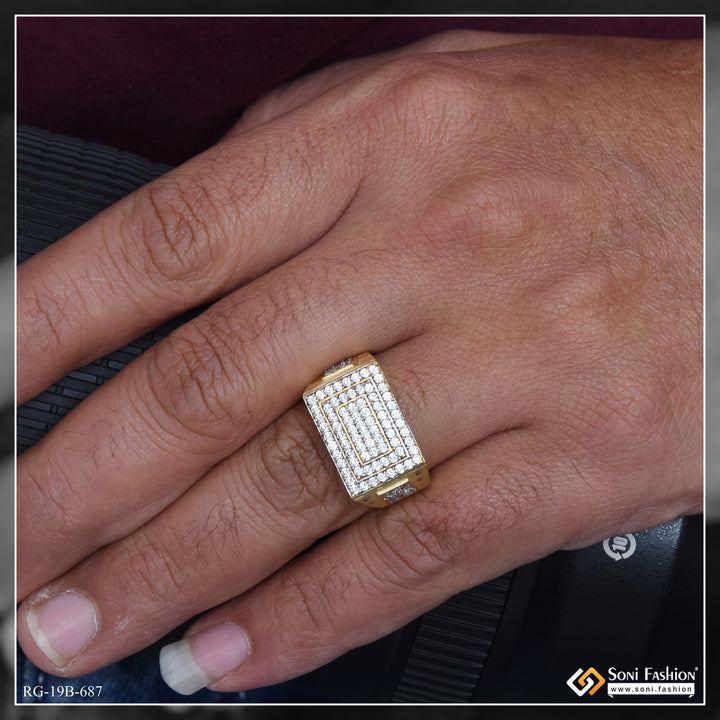 This stylish men's ring features a popular design plated with 1 gram of miligram gold over durable brass, enhanced with a shining rhodium finish for extra brilliance. The ring is adorned with a sparkling diamond, combining elegance and strength for everyday wear. Perfect for adding a touch of sophistication to any outfit.