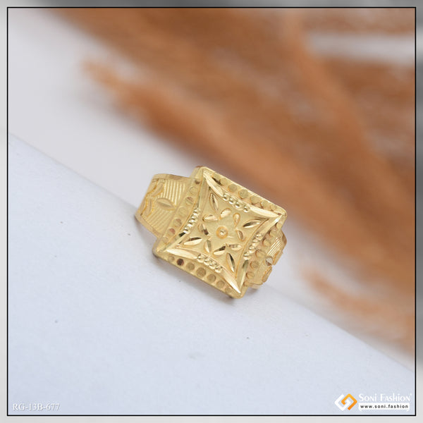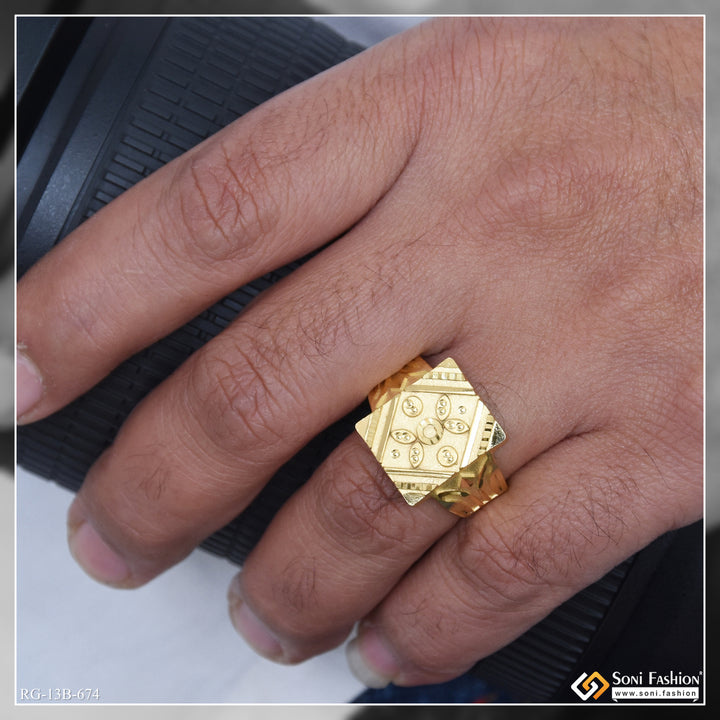 This 1 gram gold-plated men's ring features a royal rectangular design with a matt finish. Crafted from brass, it showcases intricate filigree work that adds a shining golden touch to your style. Durable and elegant, this ring combines classic charm with contemporary appeal.