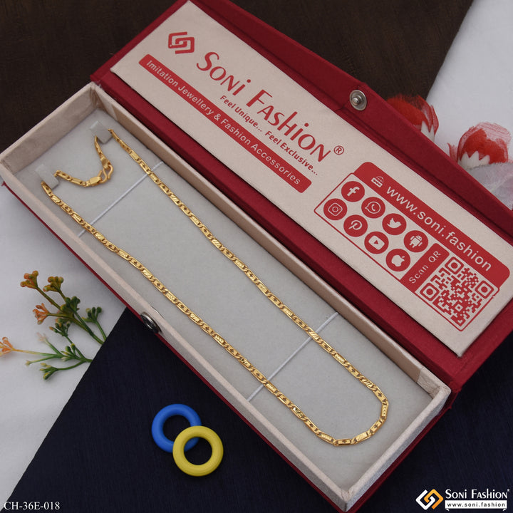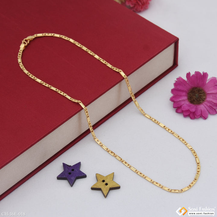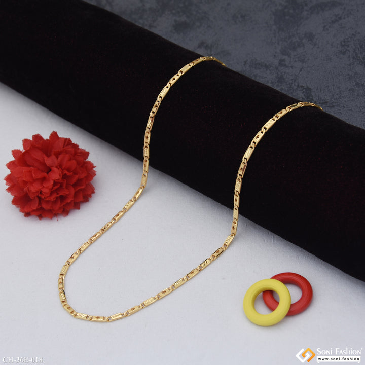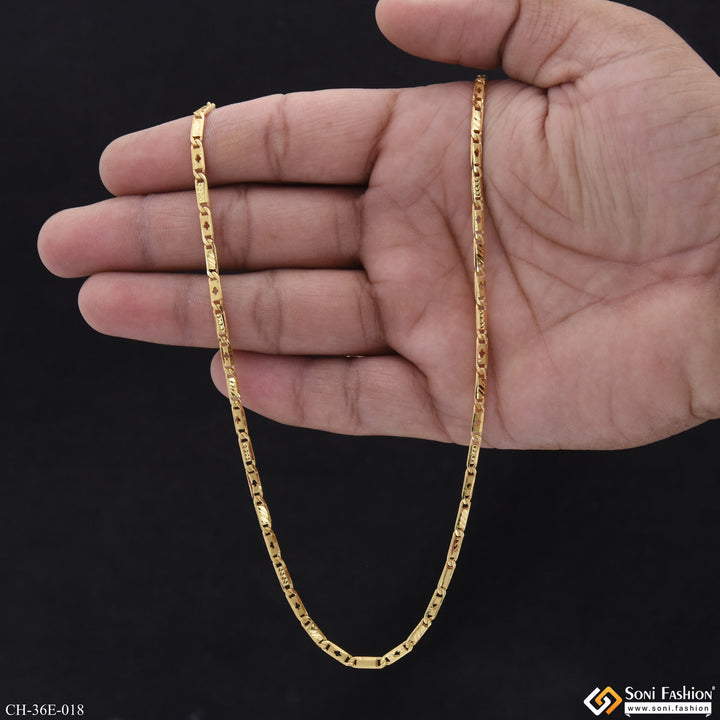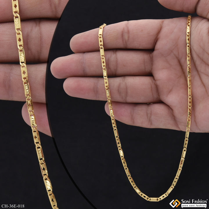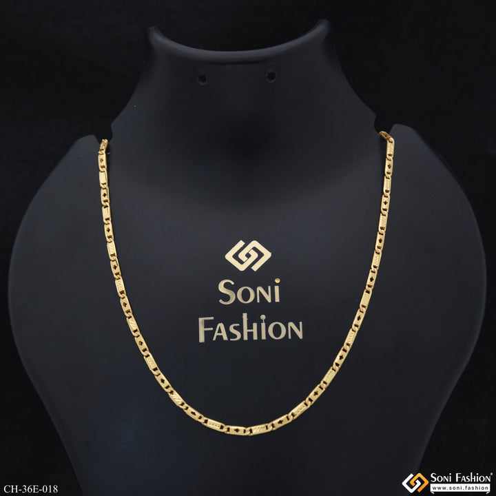 This 1 gram gold-plated Nawabi chain features a slim, matt finish design crafted from durable brass. Measuring 20 inches, it offers a stylish golden look perfect for men seeking a subtle yet elegant accessory. Its lightweight build ensures comfortable wear throughout the day.