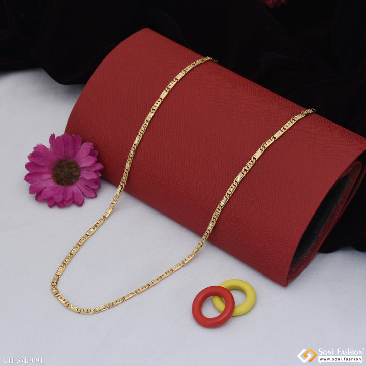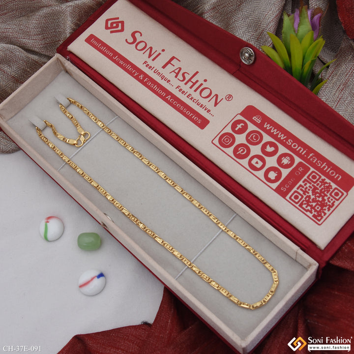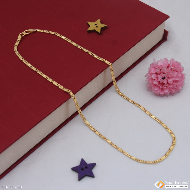 Elevate your style with this 1 gram gold-plated Nawabi chain, crafted in a slim, matt-finish design. Made from durable brass and measuring 20 inches, this miligram gold chain offers a subtle yet sophisticated golden shine perfect for everyday wear. Its lightweight construction ensures comfort while adding a touch of classic elegance to any outfit.