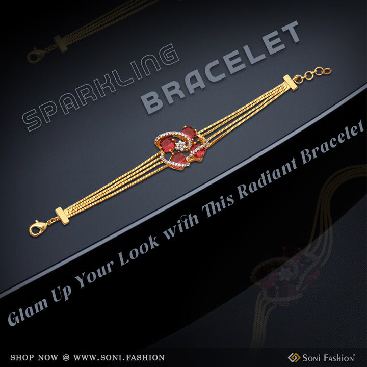 Elevate your style with our 1 Gram Gold Plated Sparkling Design Bracelet. The shining brass bracelet features a stunning pink stone and a sparkling diamond for a touch of glamour. With its latest trend design, this golden bracelet is perfect for any fashionable lady.