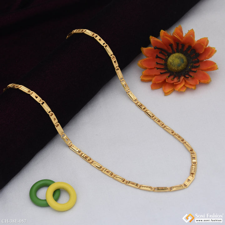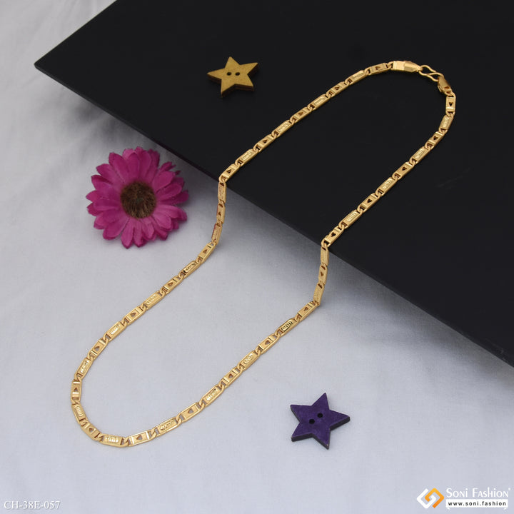 This 1 gram gold-plated Nawabi chain combines traditional elegance with modern style. Crafted from durable brass with a matt golden finish, this 21-inch chain offers a subtle yet distinctive look perfect for everyday wear or special occasions. Its lightweight design ensures comfort while adding a touch of sophistication to any outfit.